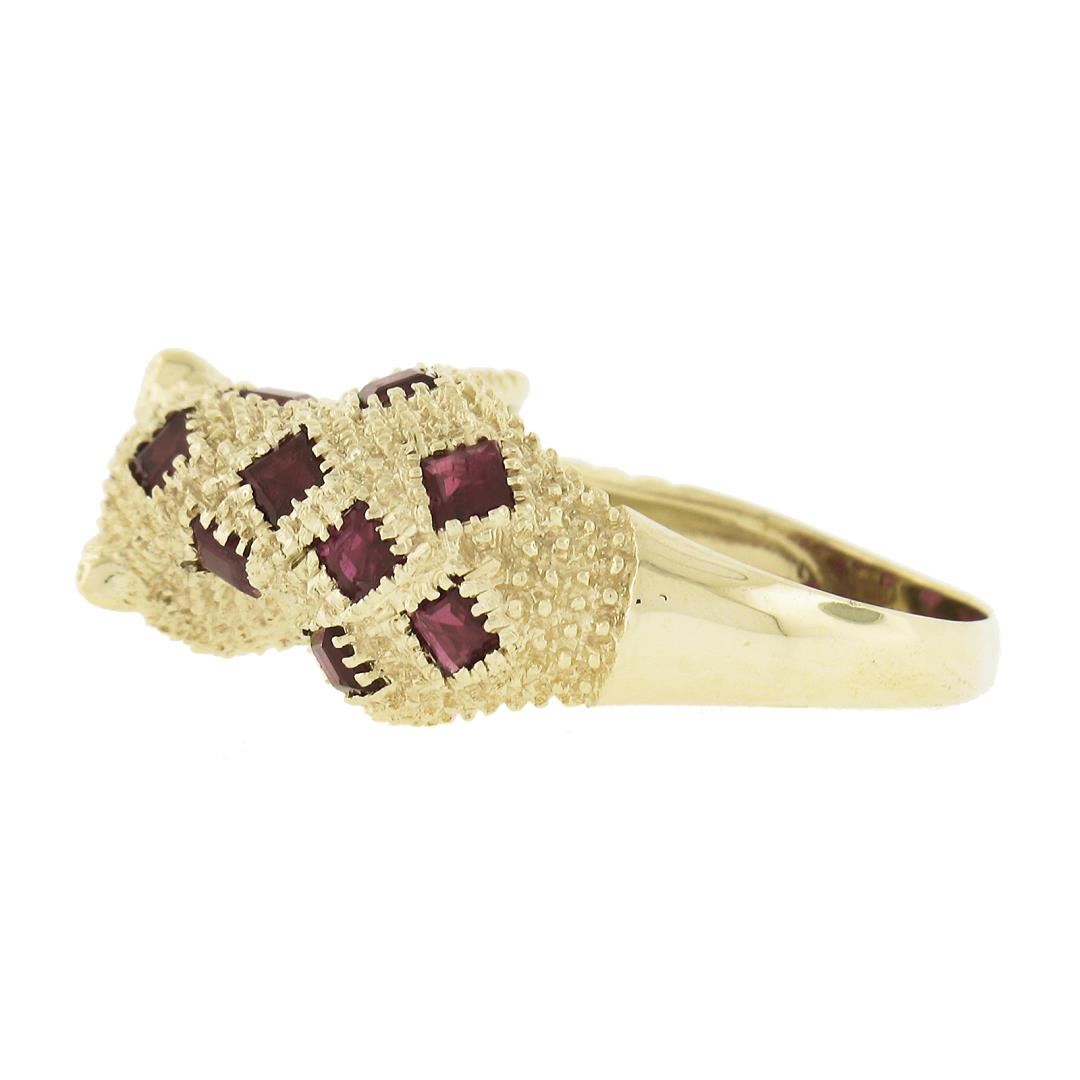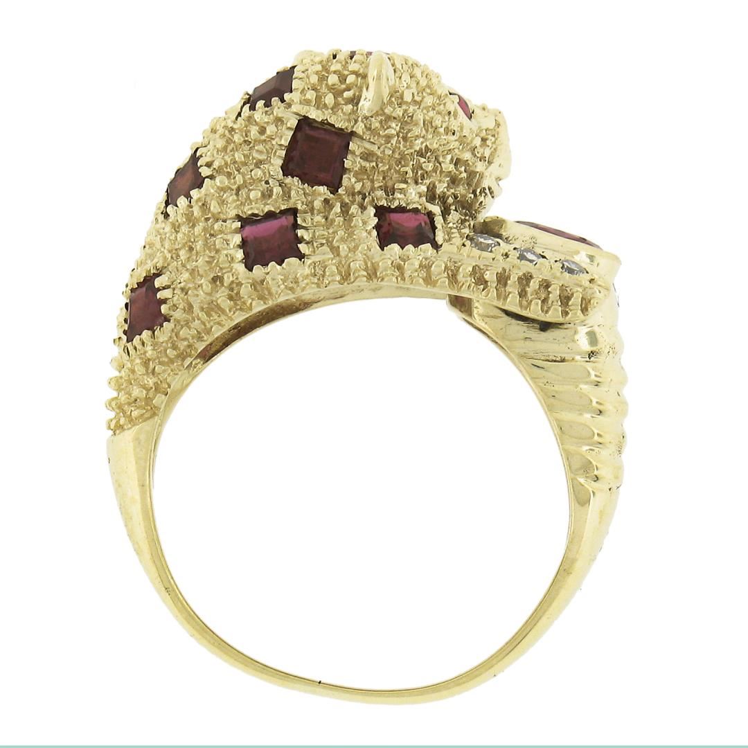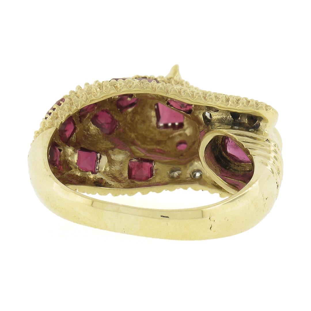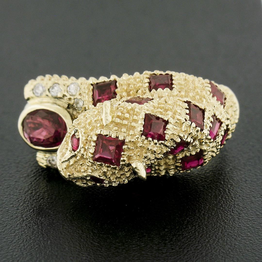 A solid 14k yellow gold leopard ring, with 12 square cut, 2 round cabochon, 1 round cabochon cut natrual rubies (1.50ctw), and 8 round cut natural diamonds (F-H - VS1/VS2 ; 0.10ctw ). The ring is size 6.0, weighs a total of 7.43 grams, and measures 10.2mm wide.