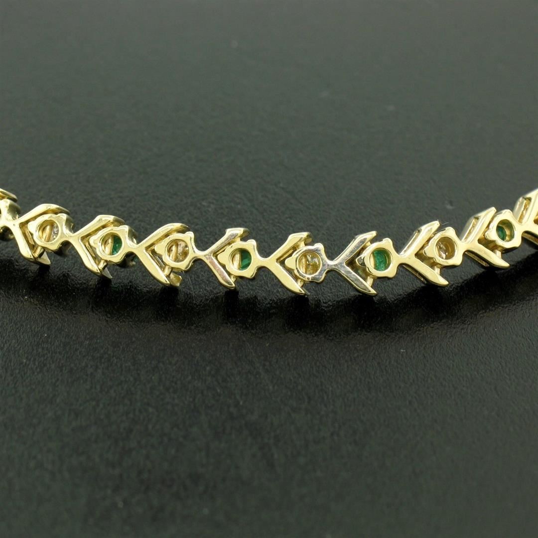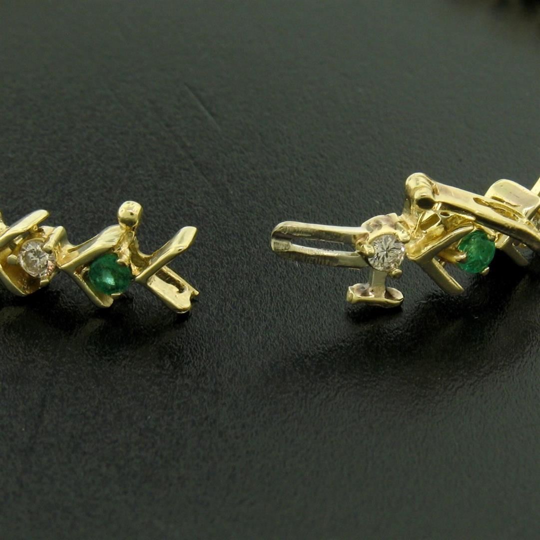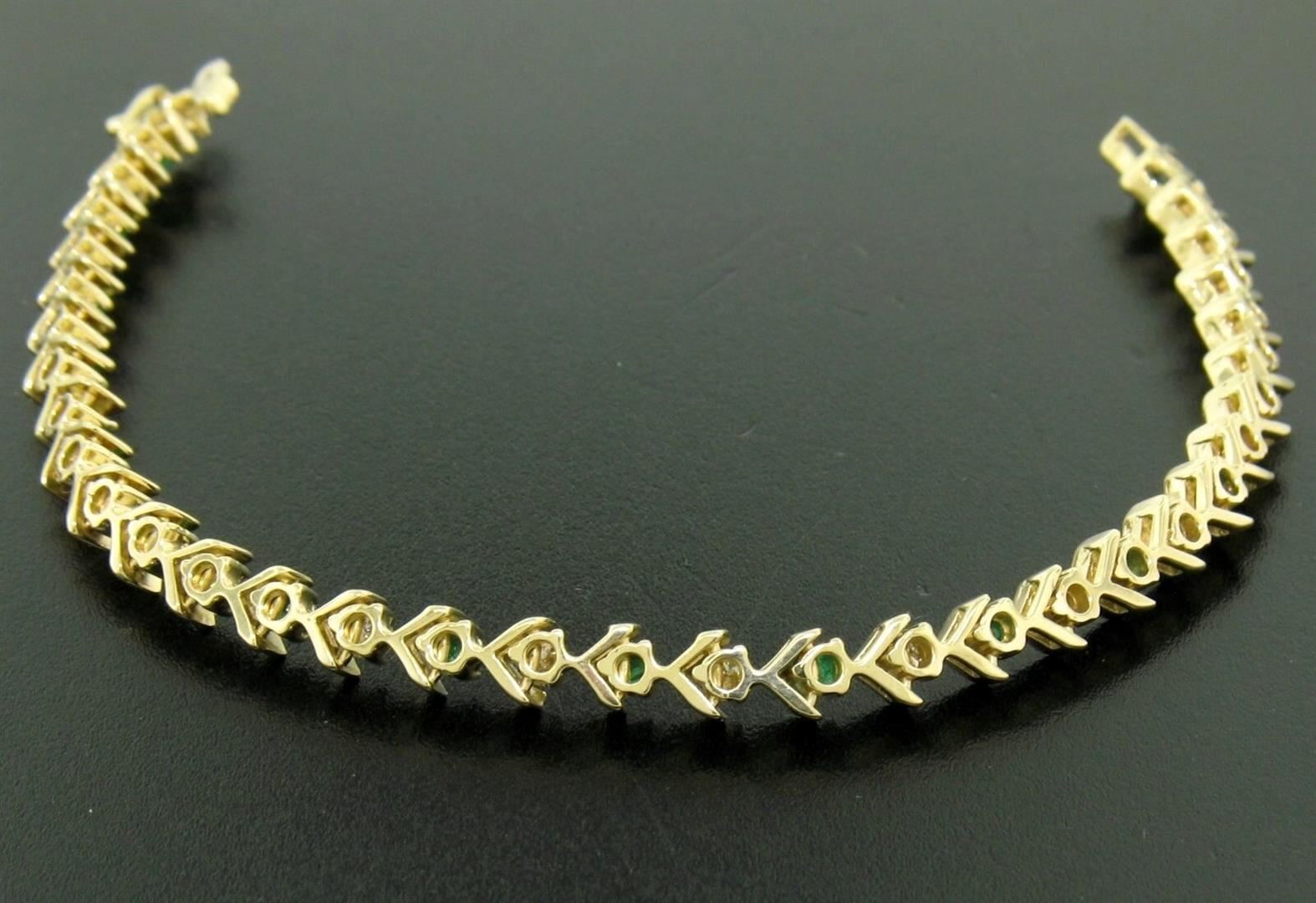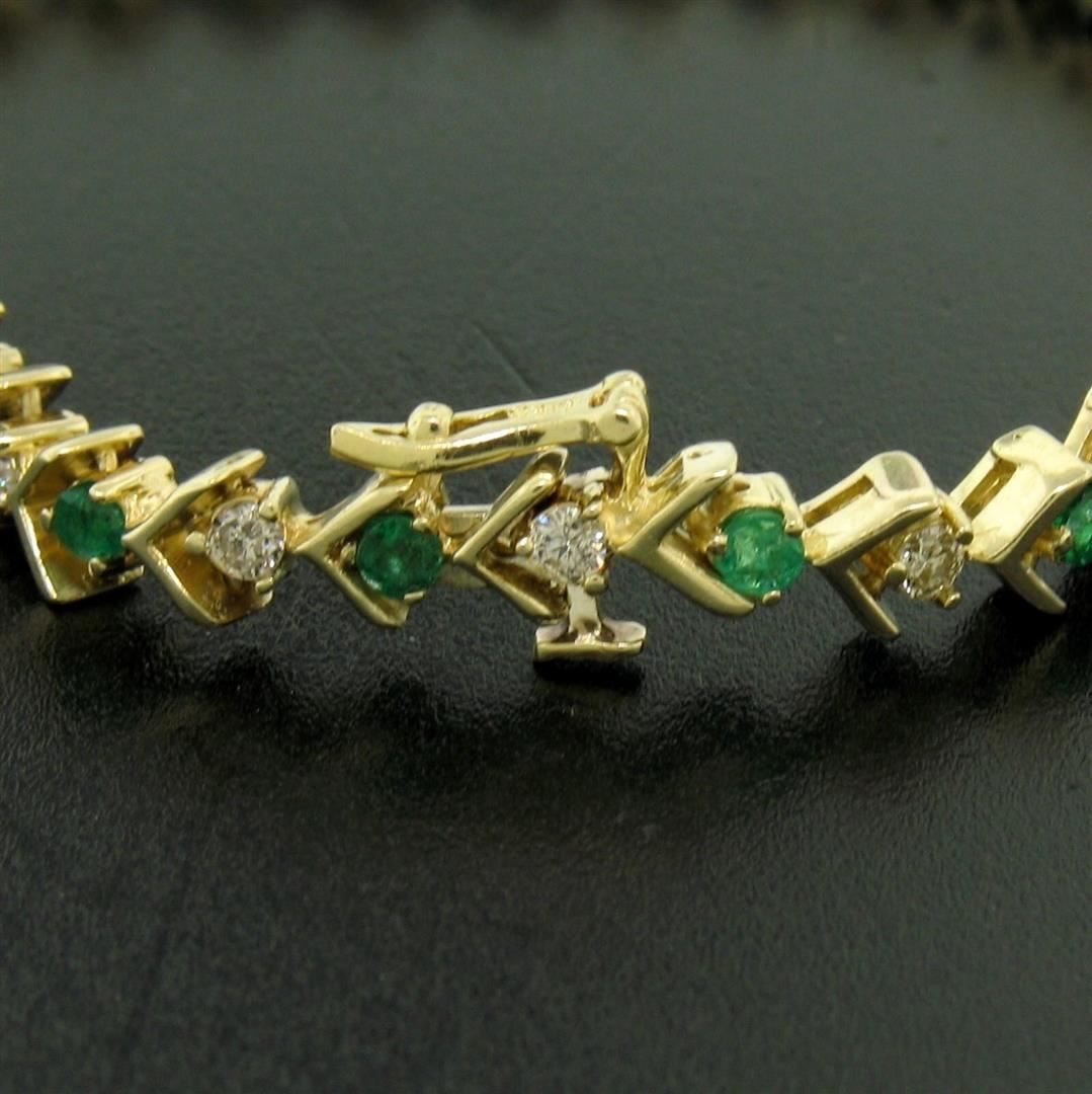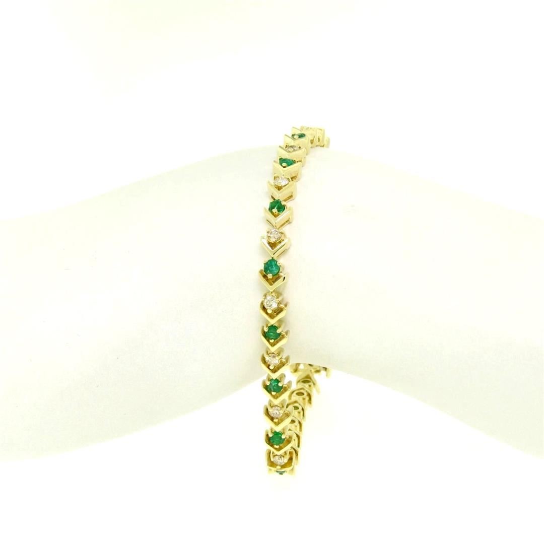14k Yellow Gold 1.87ctw Round Brilliant Diamond & Emerald Line Tennis Bracelet. Please see photos and description for all available information. An estate solid 14k yellow gold tennis bracelet, with alternated 17 round brilliant cut natural emeralds (1.02ctw ), and 17 round brilliant cut natural diamonds (G/H- VS2/SI1; 0.85ctw). It weighs a total of 13.8 grams, measures 5.25mm wide, and measures 7.0 inches in length.