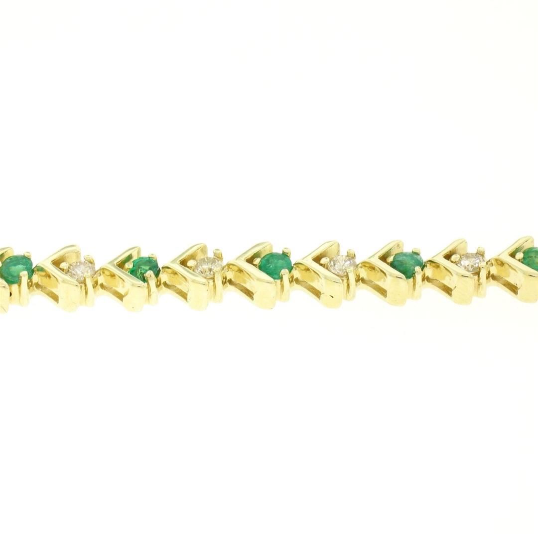 14k Yellow Gold 1.87ctw Round Brilliant Diamond & Emerald Line Tennis Bracelet. Please see photos and description for all available information. An estate solid 14k yellow gold tennis bracelet, with alternated 17 round brilliant cut natural emeralds (1.02ctw ), and 17 round brilliant cut natural diamonds (G/H- VS2/SI1; 0.85ctw). It weighs a total of 13.8 grams, measures 5.25mm wide, and measures 7.0 inches in length.