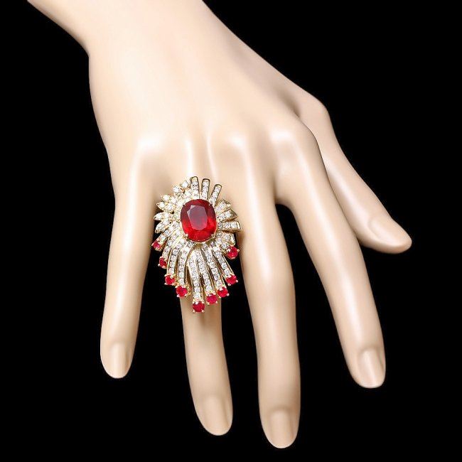 Retail: $23,850.00 ****** 14k Yellow Gold 10ct Ruby 3.70ct Diamond Ring ****** Metal: 14k Solid Yellow Gold / Size: 7 / Total Item Weight: 18.0 grams / Country Made: United States / / Main Stone: Ruby / Color: Red / Carat Total Weight: 8.00 / Treatment: Filling / Clarity: Type 2 / Cut: Very Good / / Secondary Stone: Diamond / Carat Total Weight: 3.70 / Treatment: None / Color Grade: H - I / Clarity: SI1 - SI2 / Cut: Very Good / / Side Stone: Ruby / Color: Red / Carat Total Weight: 2.00 / Treatment: None / Clarity: Type 2 / Cut: Very Good /