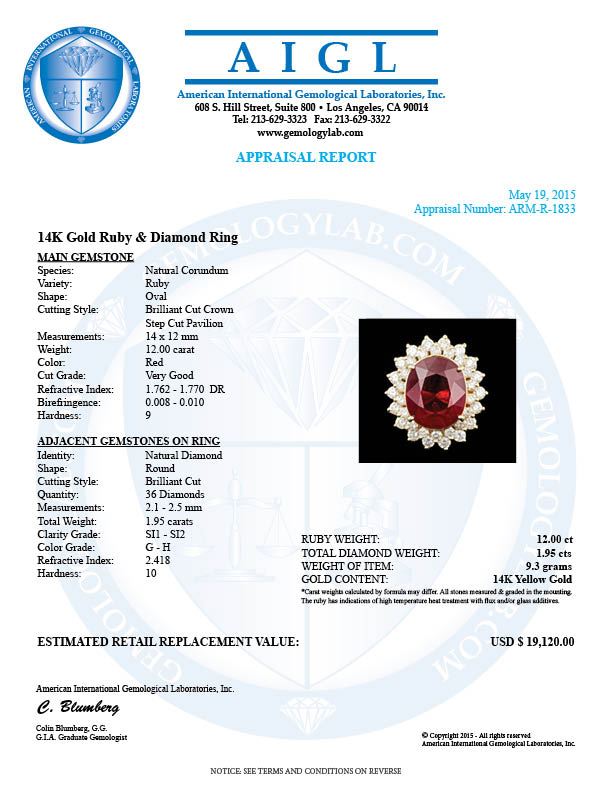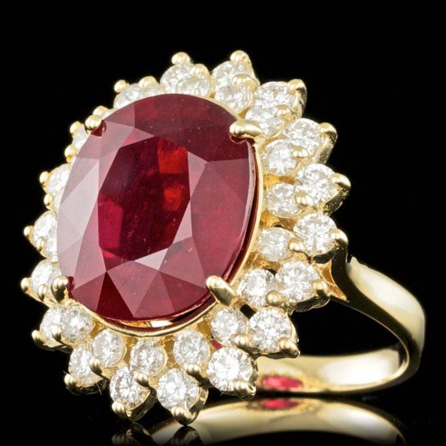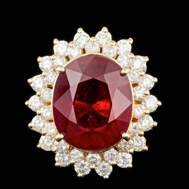 Retail: $19,000.00 ****** 14k Yellow Gold 12.00ct Ruby 1.95ct Diamond Ring ****** Metal: 14k Solid Yellow Gold / Size: 7 / Total Item Weight: 9.3 grams / Country Made: United States / / Main Stone: Ruby / Color: Red / Carat Total Weight: 12.00 / Treatment: Filling / Clarity: Type 2 / Cut: Very Good / / Secondary Stone: Diamond / Carat Total Weight: 1.95 / Treatment: None / Color Grade: G - H / Clarity: SI1 - SI2 / Cut: Very Good /
