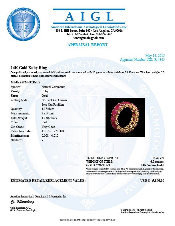 Retail: $5,800.00 ****** 14k Yellow Gold 13.30ct Ruby Ring ****** Metal: 14k Solid Yellow Gold / Total Item Weight: 6.0 grams / Country Made: United States / / Main Stone: Ruby / Color: Red / Carat Total Weight: 13.30 / Treatment: None / Clarity: Type 2 / Cut: Very Good /