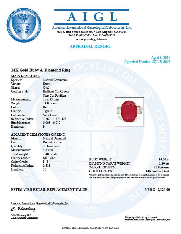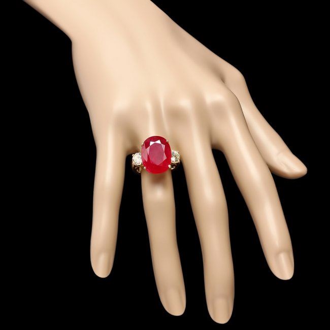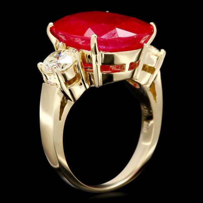 Retail: $9,000.00 ****** 14k Yellow Gold 14.00ct Ruby 1.40ct Diamond Ring ****** Metal: 14k Solid Yellow Gold / Size: 7.25 / Total Item Weight: 10.0 grams / Country Made: United States / / Main Stone: Ruby / Color: Red / Carat Total Weight: 14.00 / Treatment: Filling / Clarity: Type 2 / Cut: Very Good / / Secondary Stone: Diamond / Carat Total Weight: 1.40 / Treatment: None / Color Grade: I - J / Clarity: SI1 - SI2 / Cut: Very Good /
