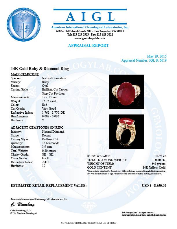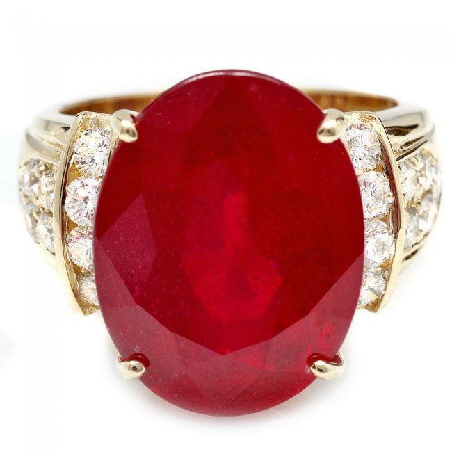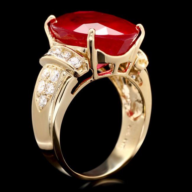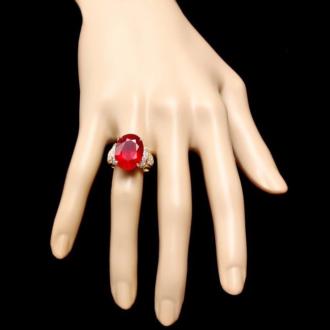 Retail: $8,900.00 ****** 14k Yellow Gold 15.75ct Ruby 0.80ct Diamond Ring ****** Metal: 14k Solid Yellow Gold / Size: 7 / Total Item Weight: 9.0 grams / Country Made: United States / / Main Stone: Ruby / Color: Red / Carat Total Weight: 15.75 / Treatment: Filling / Clarity: Type 2 / Cut: Very Good / / Secondary Stone: Diamond / Carat Total Weight: 0.80 / Treatment: None / Color Grade: G - H / Clarity: SI1 - SI2 / Cut: Very Good /