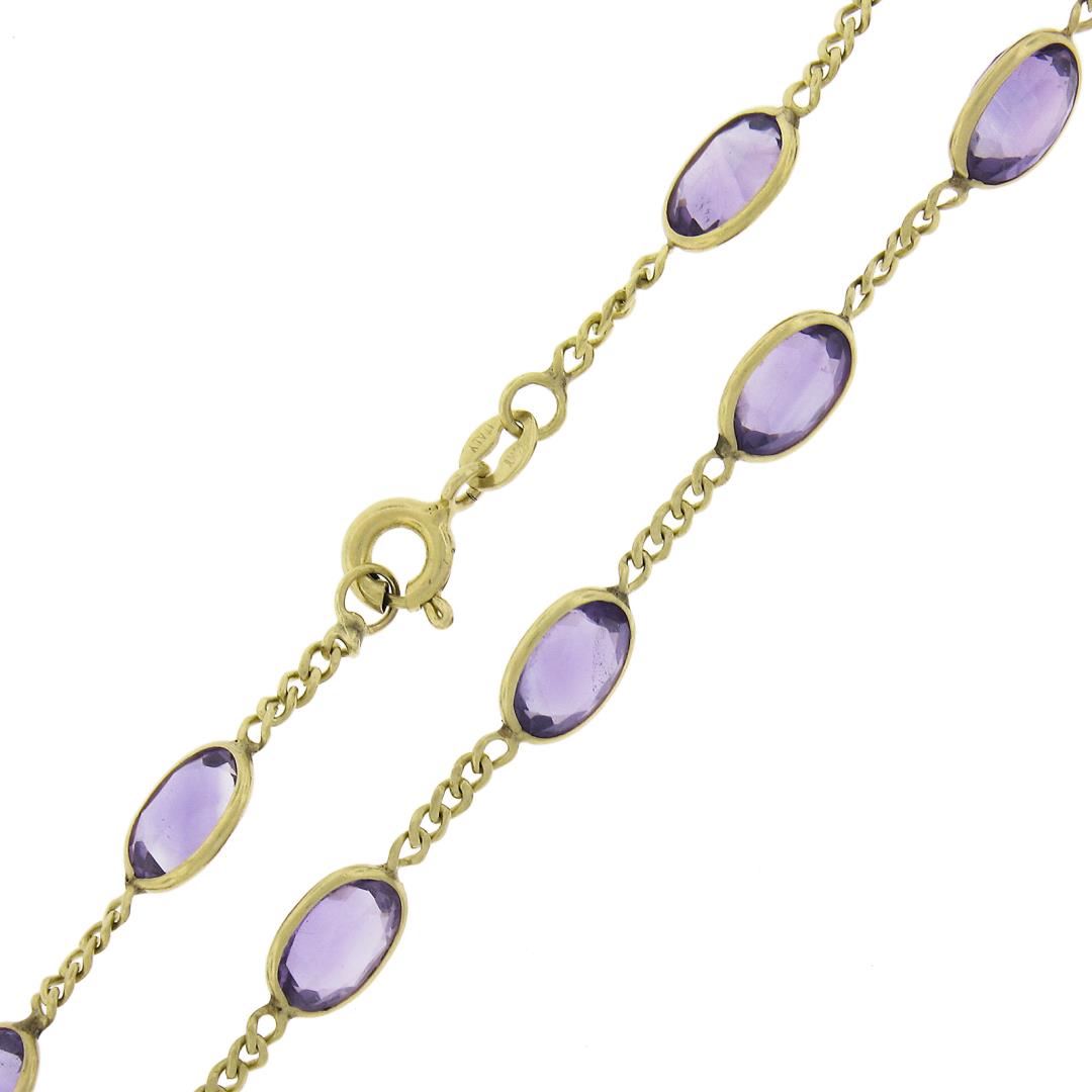 A solid 14k yellow gold by the yard link necklace, with 25 oval cut natural amethysts (15ctw). It weighs a total of 6.95 grams, measures 5.8mm wide, and measures 16.25 inches in length.