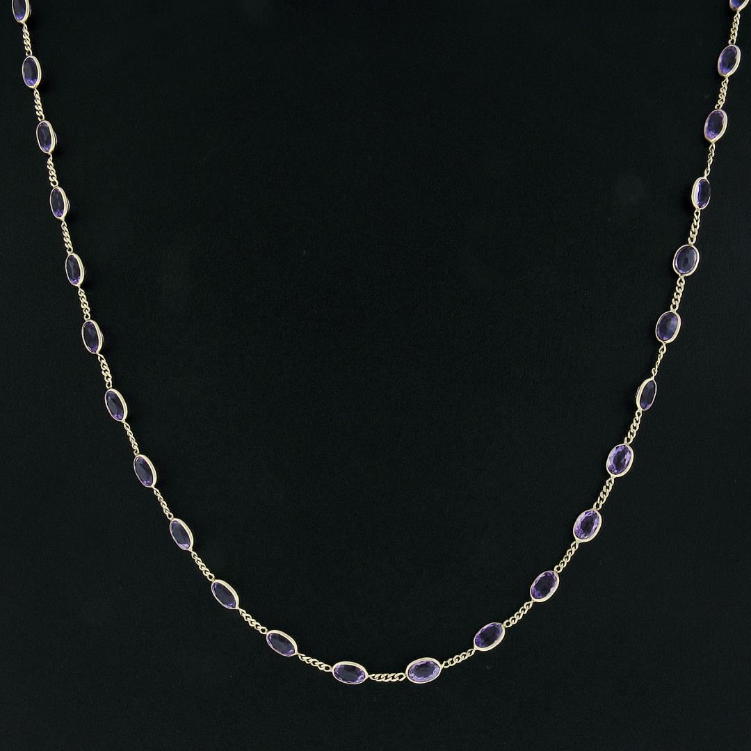 A solid 14k yellow gold by the yard link necklace, with 25 oval cut natural amethysts (15ctw). It weighs a total of 6.95 grams, measures 5.8mm wide, and measures 16.25 inches in length.