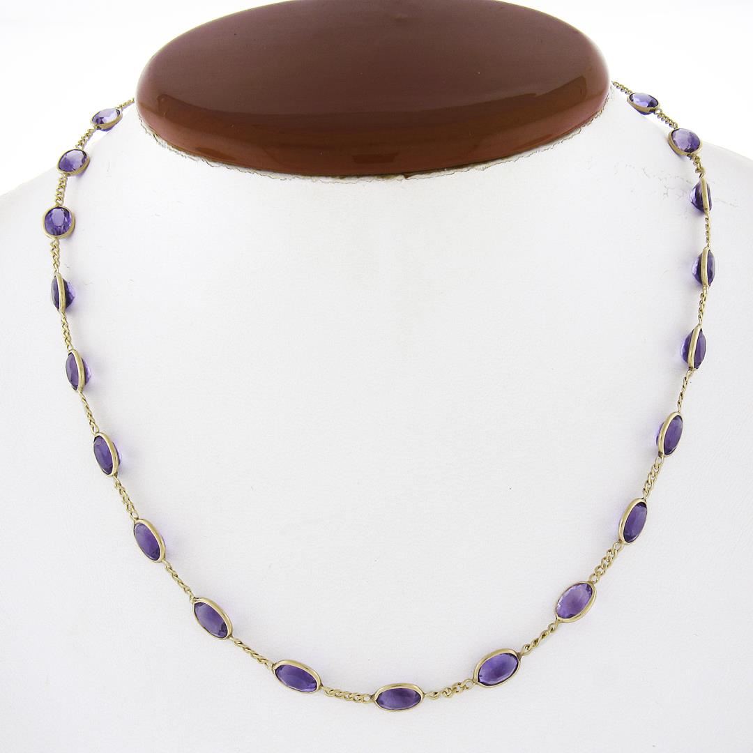 A solid 14k yellow gold by the yard link necklace, with 25 oval cut natural amethysts (15ctw). It weighs a total of 6.95 grams, measures 5.8mm wide, and measures 16.25 inches in length.