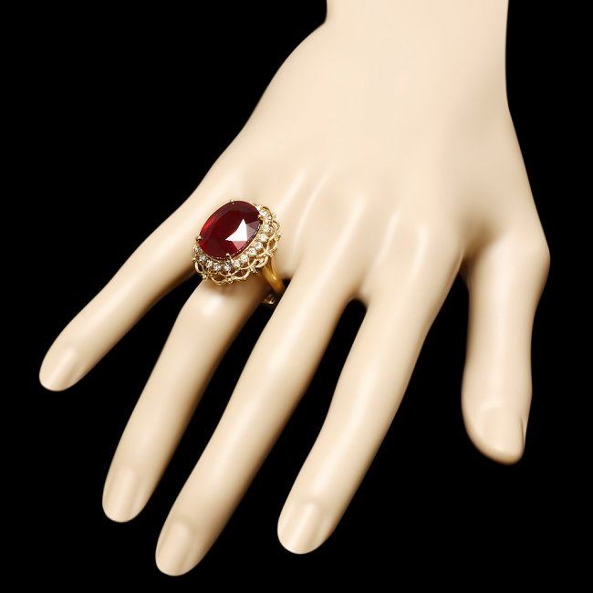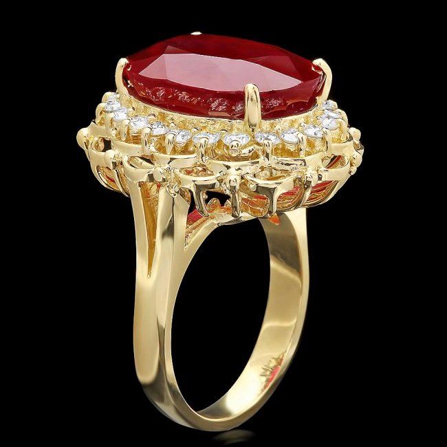 Retail: $9,200.00 ****** 14k Yellow Gold 16.00ct Ruby 0.80ct Diamond Ring ****** Metal: 14k Solid Yellow Gold / Size: 7.25 / Total Item Weight: 12.0 grams / Country Made: United States / / Main Stone: Ruby / Color: Red / Carat Total Weight: 16.00 / Treatment: Filling / Clarity: Type 2 / Cut: Very Good / / Secondary Stone: Diamond / Carat Total Weight: 0.80 / Treatment: None / Color Grade: H - I / Clarity: SI1 - SI2 / Cut: Very Good /
