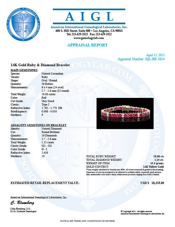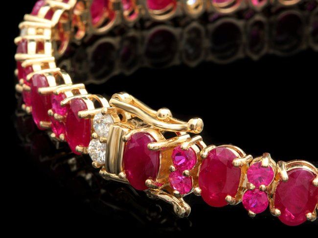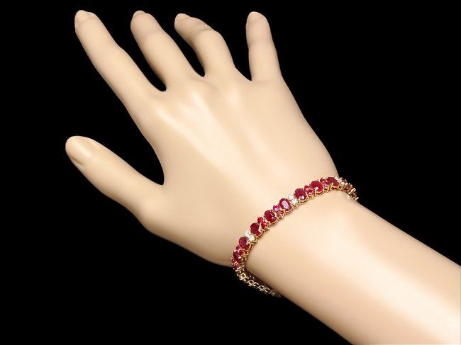 Retail: $18,230.00 ****** 14k Yellow Gold 18ct Ruby 1.15ct Diamond Bracelet ****** Metal: 14k Solid Yellow Gold / Size: 7 / Total Item Weight: 15.5 grams / Country Made: United States / / Main Stone: Ruby / Color: Red / Carat Total Weight: 15.00 / Treatment: None / Clarity: Type 2 / Cut: Very Good / / Secondary Stone: Diamond / Carat Total Weight: 1.15 / Treatment: None / Color Grade: H - I / Clarity: SI1 - SI2 / Cut: Very Good / / Side Stone: Ruby / Color: Red / Carat Total Weight: 3.00 / Treatment: None / Clarity: Type 2 / Cut: Very Good /