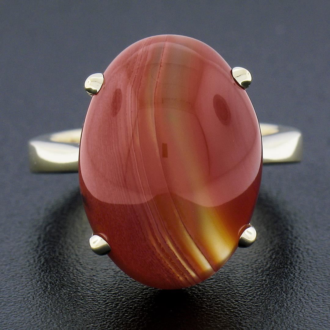A solid 14k yellow gold ring, with 1 oval cabochon cut natural agate (18x13mm). The ring is size 6.5, weighs a total of 7.62 grams, and measures 18mm wide.