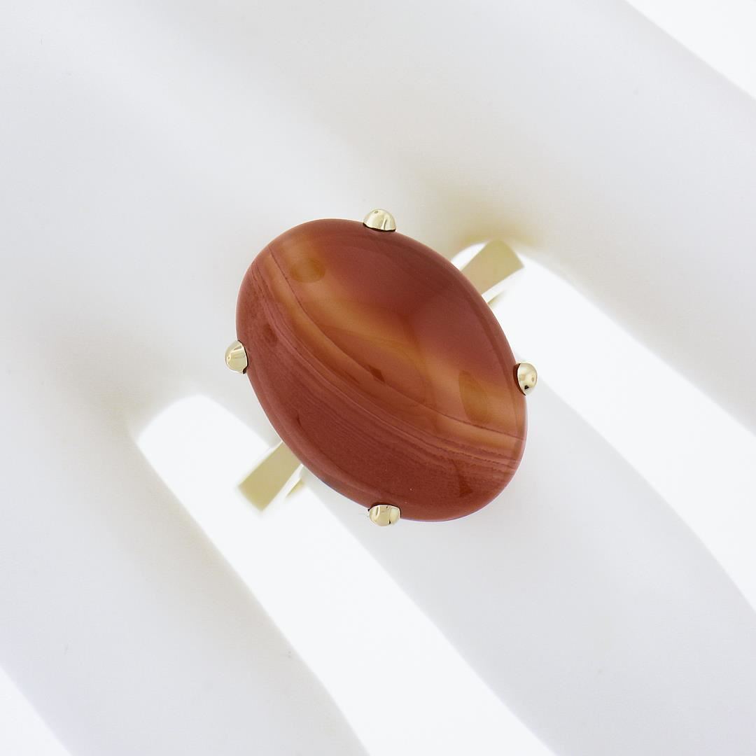 A solid 14k yellow gold ring, with 1 oval cabochon cut natural agate (18x13mm). The ring is size 6.5, weighs a total of 7.62 grams, and measures 18mm wide.