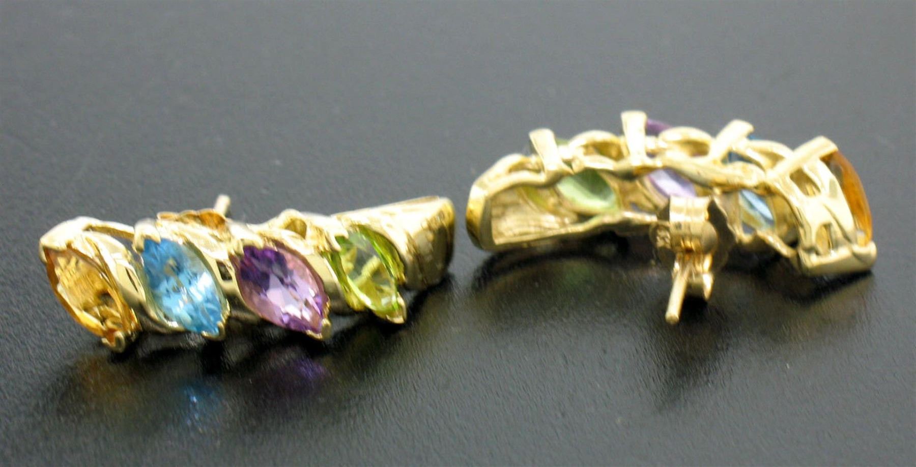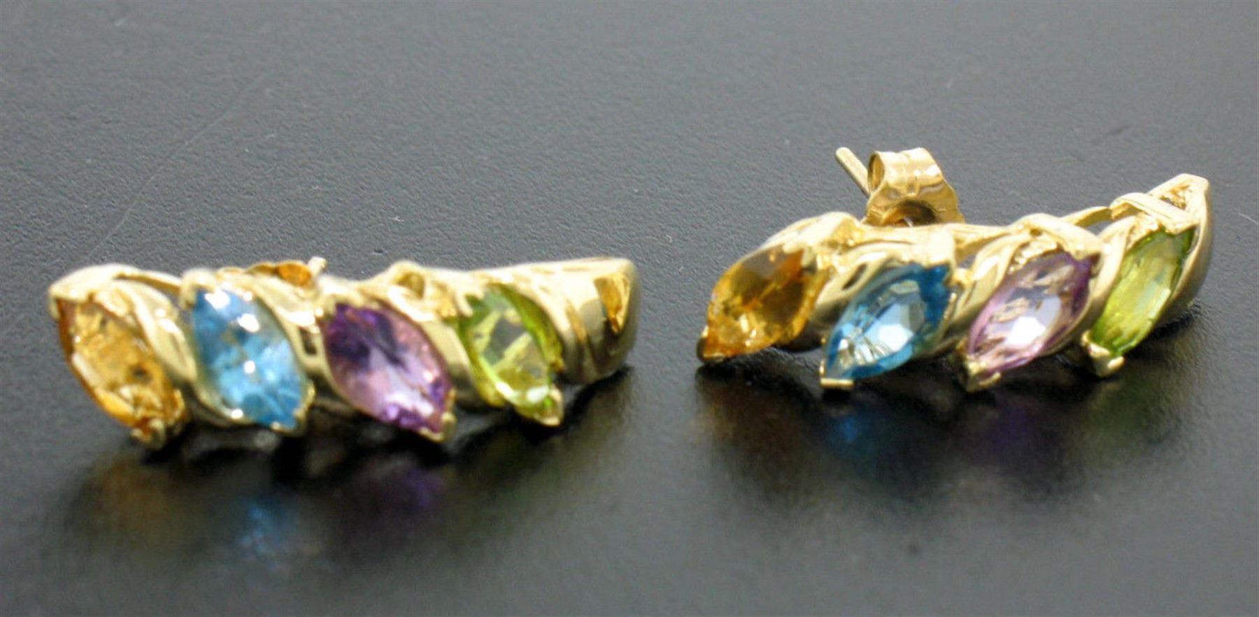 14k Yellow Gold 2.00ctw Marquise Cut Amethyst Peridot & Topaz Cuff Post Earrings. Please see photos and description for all available information. An estate solid 14k yellow gold cuff post earrings, featuring marquise cut of 4 natural topaz, 2 natural amethyst, 2 natural peridot (2.00ctw). The earrings measure approximately 21.30x6.07mm and weigh a total of 4.0 grams.