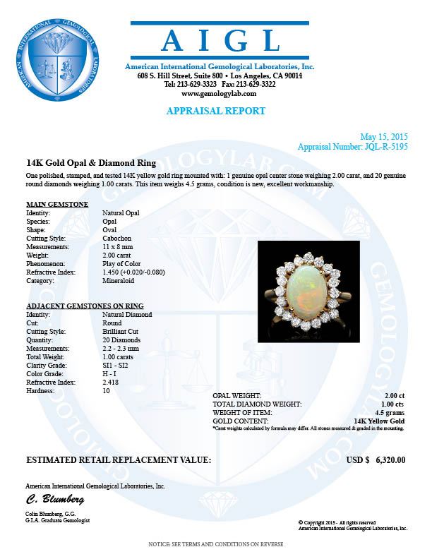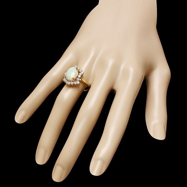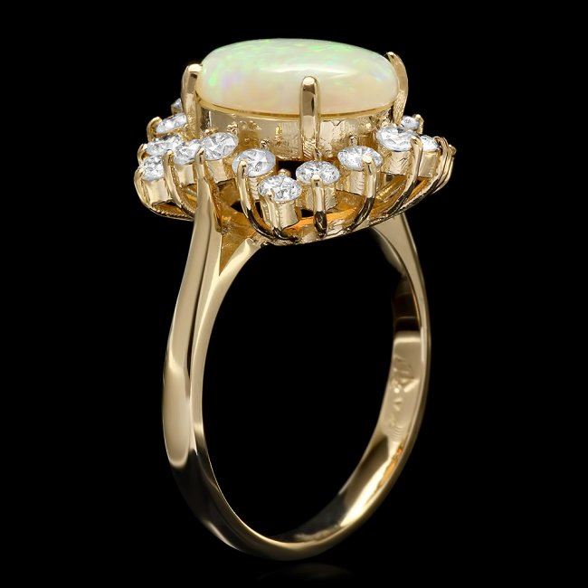 Retail: $6,200.00 ****** 14k Yellow Gold 2.00ct Opal 1.00ct Diamond Ring ****** Metal: 14k Solid Yellow Gold / Total Item Weight: 4.5 grams / Country Made: United States / / Main Stone: Opal / Color: Multi-Colored / Carat Total Weight: 2.00 / Treatment: None / Origin: Australia / Type: Crystal / Toughness: Good / / Secondary Stone: Diamond / Carat Total Weight: 1.00 / Treatment: None / Color Grade: H - I / Clarity: SI1 - SI2 / Cut: Very Good /