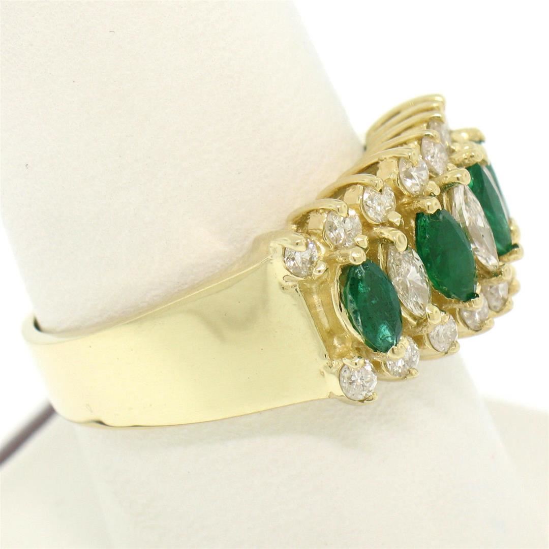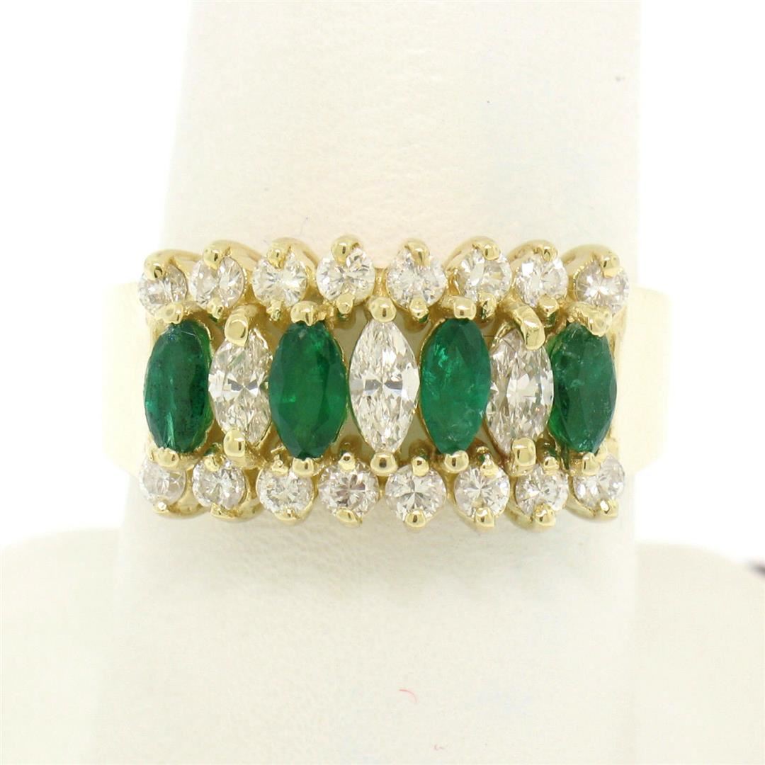 One 14k Yellow Gold 2.02ctw Prong Marquise Emerald & Diamond Ring + 16 Round Diamonds. Item Details: Material: 14k Solid Yellow Gold, Weight: 7.2 Grams, Stone(s): (4) Natural Genuine Emeralds - Marquise Cut - Prong Set - Rich Emerald Green Color - 0.76ctw (approx.), (3) Natural Genuine Diamonds - Marquise Cut - Prong Set - G/H Color - VS2/SI1 Clarity - 0.54ctw (approx.), (16) Natural Genuine Diamonds - Round Brilliant Cut - Prong Set - G/H Color - VS2/SI1 Clarity - 0.72ctw (approx.), Total Carat Weight: 2.02 (approx.), Ring Size: 8.75 (We can custom size this ring.), Ring Width: 10.56mm, Ring Height: 6.68mm rise off the finger, Condition: Like New!