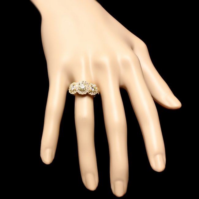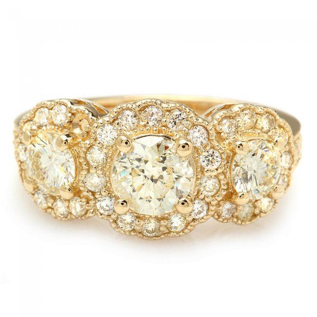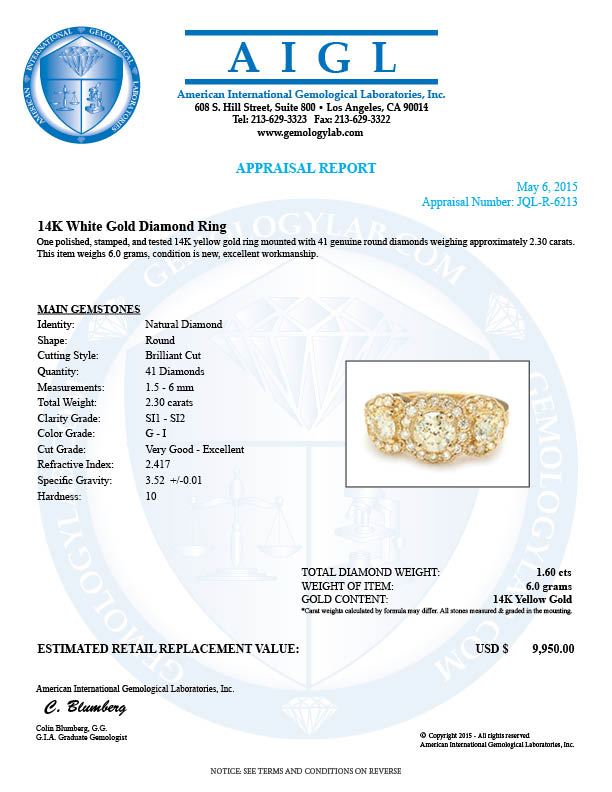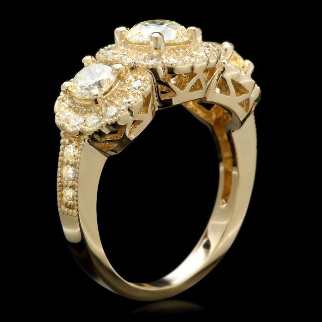 Retail: $9,850.00 ****** 14k Yellow Gold 2.3ct Diamond Ring ****** Metal: 14k Solid Yellow Gold / Size: 7 / Total Item Weight: 6.0 grams / Country Made: United States / / Main Stone: Diamond / Color: White / Carat Total Weight: 1.60 / Treatment: None / Color Grade: H - I / Clarity: SI2 - I1 / Cut: Very Good / / Secondary Stone: Diamond / Carat Total Weight: 0.70 / Treatment: None / Color Grade: G - H / Clarity: SI1 - SI2 / Cut: Very Good /