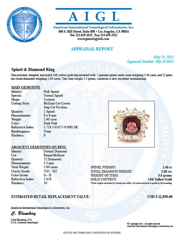 Retail: $11,850.00 ****** 14k Yellow Gold 2.40ct Spinel 2.00ct Diamond Ring ****** Metal: 14k Solid Yellow Gold / Size: 6.75 / Total Item Weight: 5.5 grams / Country Made: United States / / Main Stone: Spinel / Color: Pink / Carat Total Weight: 2.40 / Treatment: None / Clarity: Type 2 / Cut: Very Good / / Secondary Stone: Diamond / Carat Total Weight: 2.00 / Treatment: None / Color Grade: G - H / Clarity: SI1 - SI2 / Cut: Very Good /