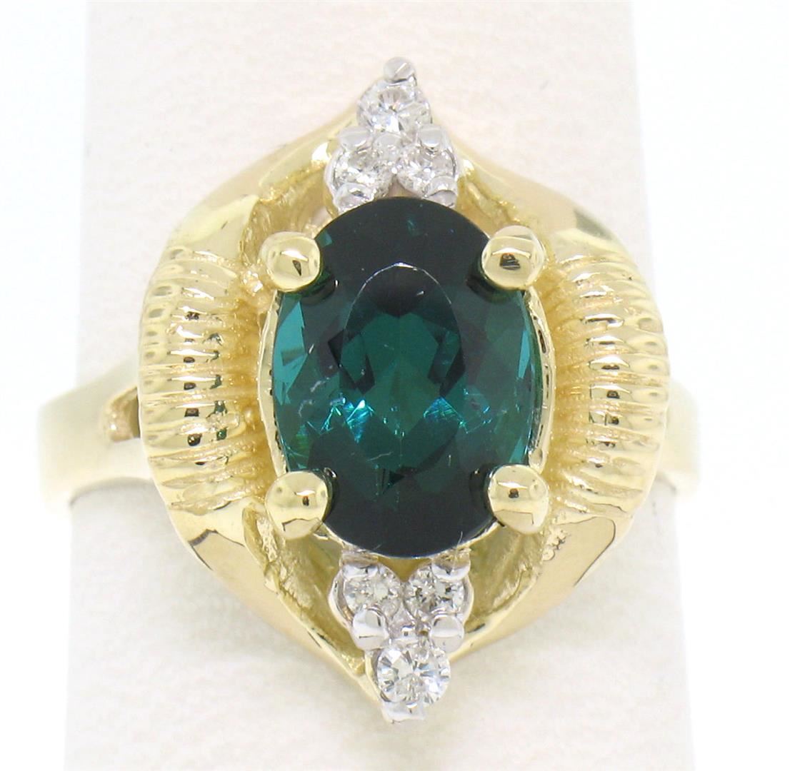 One 14k Yellow Gold 2.41ctw Green Blue Oval UNIQUE Tourmaline & Diamond Dinner Ring. Item Details: Material: 14k Solid Yellow Gold, Weight: 5.7 Grams, Stone(s): (1) Natural Genuine Tourmaline - Oval Cut - Prong Set - Clear and Deep Green With A Slight Dark Blue Hue - 2.25ct (approx.), (6) Natural Genuine Diamonds - Round Brilliant Cut - Prong Set - G Color - VS2 Clarity - 0.16ctw (approx.), Total Carat Weight: 2.41 (approx.), Ring Size: 6 (We can custom size this ring.), Ring Width: 17.89mm, Condition: New w/o Tag