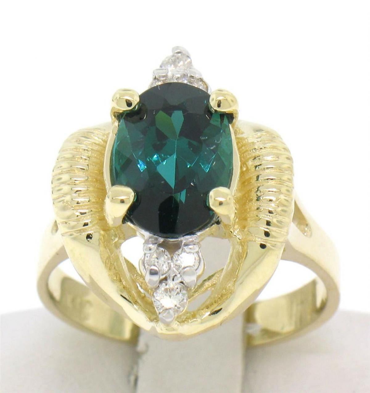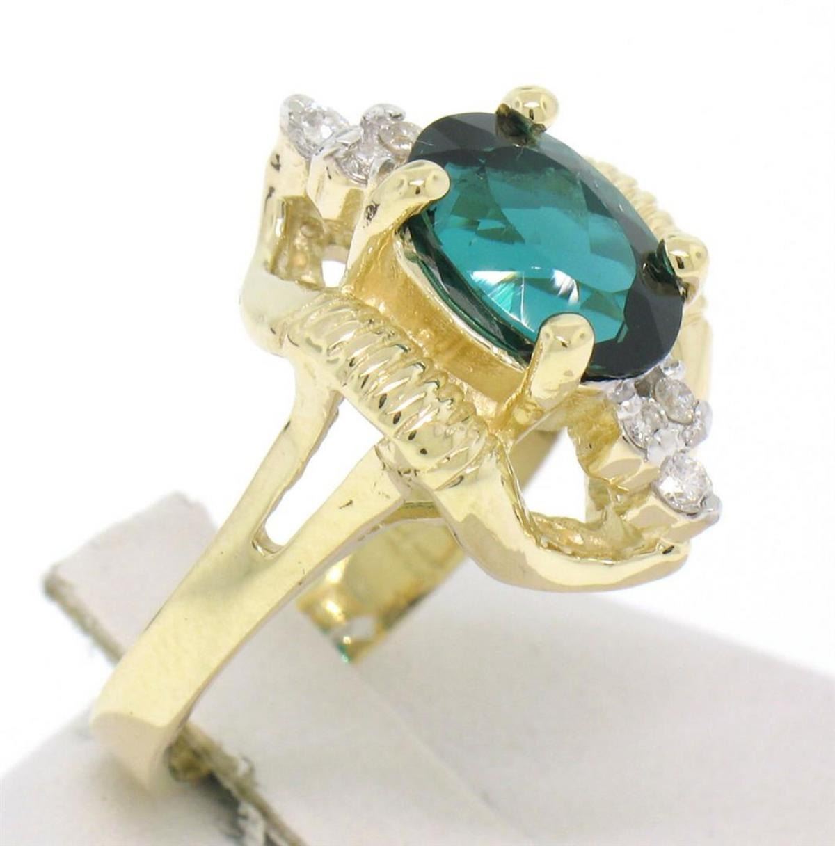 One 14k Yellow Gold 2.41ctw Green Blue Oval UNIQUE Tourmaline & Diamond Dinner Ring. Item Details: Material: 14k Solid Yellow Gold, Weight: 5.7 Grams, Stone(s): (1) Natural Genuine Tourmaline - Oval Cut - Prong Set - Clear and Deep Green With A Slight Dark Blue Hue - 2.25ct (approx.), (6) Natural Genuine Diamonds - Round Brilliant Cut - Prong Set - G Color - VS2 Clarity - 0.16ctw (approx.), Total Carat Weight: 2.41 (approx.), Ring Size: 6 (We can custom size this ring.), Ring Width: 17.89mm, Condition: New w/o Tag