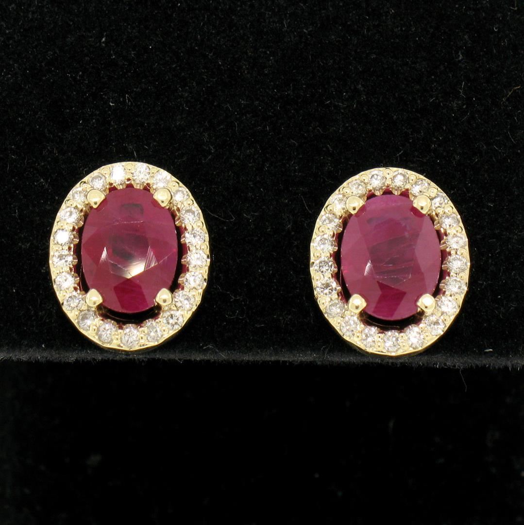 One 14k Yellow Gold 2.47ctw Oval Blood Ruby Solitaire Earrings Pave Diamond Halos. Item Details: Material: 14k Solid Yellow Gold, Weight: 2.8 Grams, Stone(s): (2) Natural Genuine Rubies - Oval Cut - Prong Set - Beautiful and Rich Blood Red Color - 2.13ctw (approx.), (42) Natural Genuine Diamonds - Round Brilliant Cut - Pavé Set - G Color - VS2 Clarity - 0.34ctw (approx.), Total Carat Weight: 2.47 (approx.), Backing: Post Backs w/ Butterfly Closures, Width: 9.58mm, Height: 11.54mm, Thickness: 3.12mm, Condition: New w/o Tag