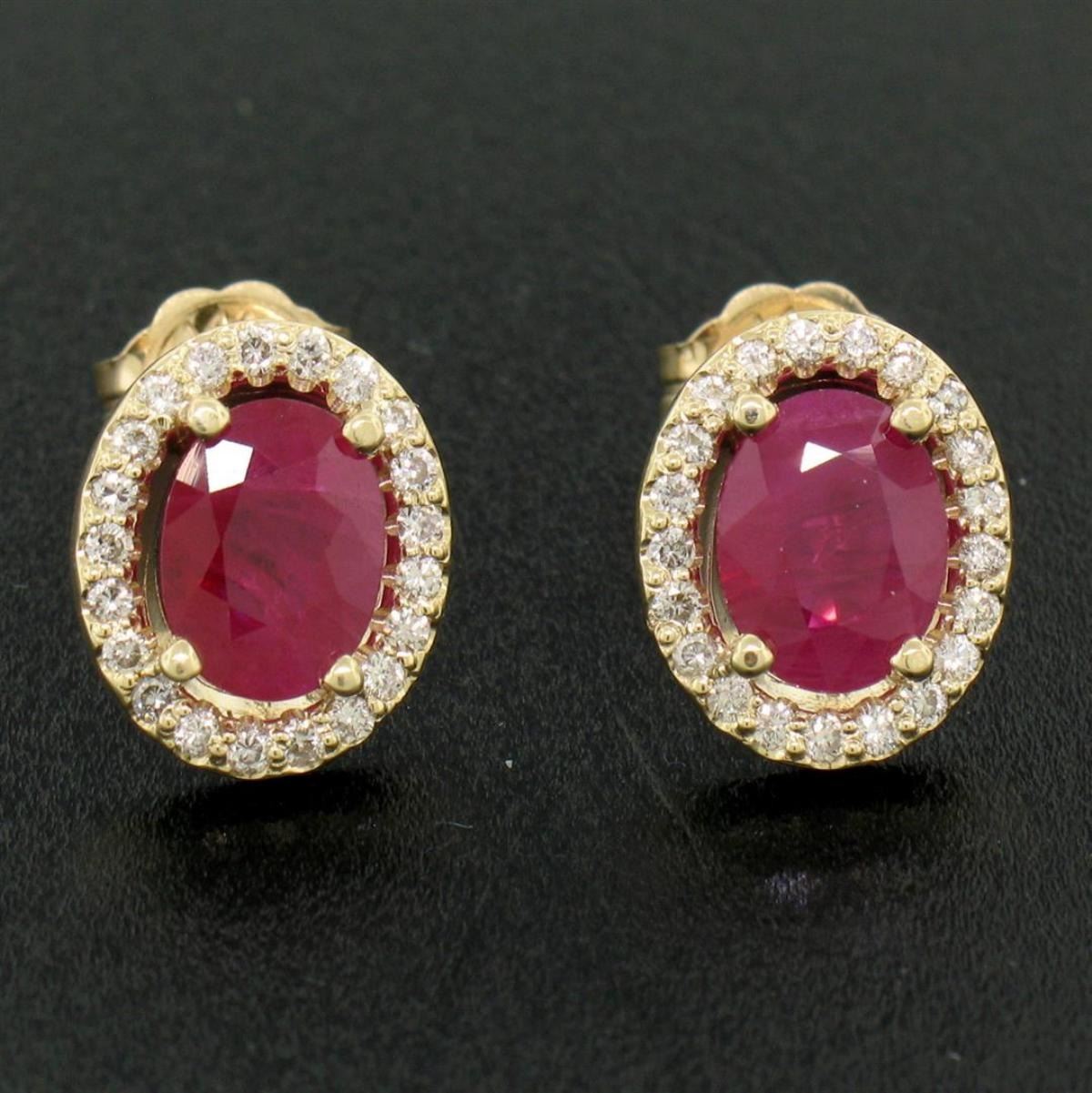 One 14k Yellow Gold 2.47ctw Oval Blood Ruby Solitaire Earrings Pave Diamond Halos. Item Details: Material:  14k Solid Yellow Gold, Weight:  2.8 Grams, Stone(s):  (2) Natural Genuine Rubies - Oval Cut - Prong Set - Beautiful and Rich Blood Red Color - 2.13ctw (approx.), (42) Natural Genuine Diamonds - Round Brilliant Cut - Pavé Set - G Color - VS2 Clarity - 0.34ctw (approx.), Total Carat Weight:  2.47 (approx.), Backing:  Post Backs w/ Butterfly Closures, Width:  9.58mm, Height:  11.54mm, Thickness:  3.12mm, Condition:  New w/o Tag