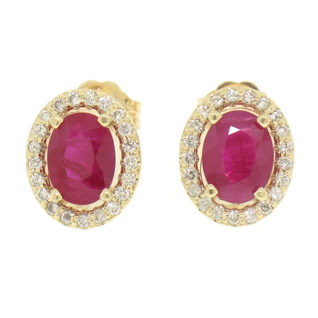 One Pair 14k Yellow Gold 2.47ctw Oval Blood Ruby Solitaire Earrings Pave Diamond Halos. Item Details: Material: 14k Solid Yellow Gold, Weight: 2.8 Grams, Stone(s): (2) Natural Genuine Rubies - Oval Cut - Prong Set - Beautiful and Rich Blood Red Color - 2.13ctw (approx.), (42) Natural Genuine Diamonds - Round Brilliant Cut - Pavé Set - G Color - VS2 Clarity - 0.34ctw (approx.), Total Carat Weight: 2.47 (approx.), Backing: Post Backs w/ Butterfly Closures, Width: 9.58mm, Height: 11.54mm, Thickness: 3.12mm, Condition: New w/o Tag
