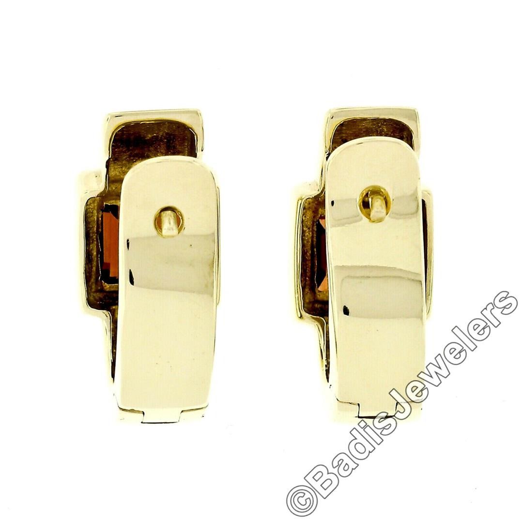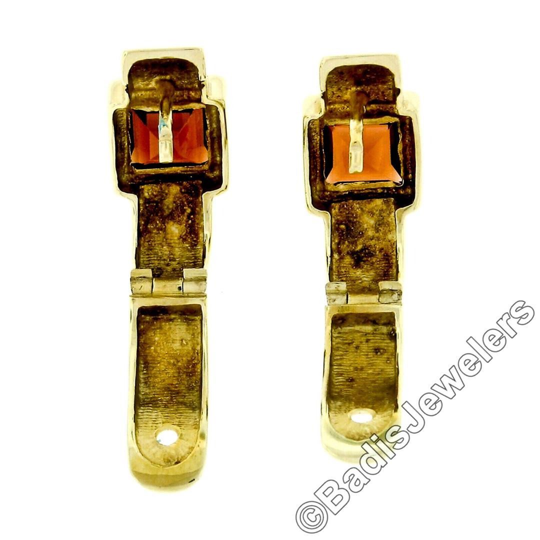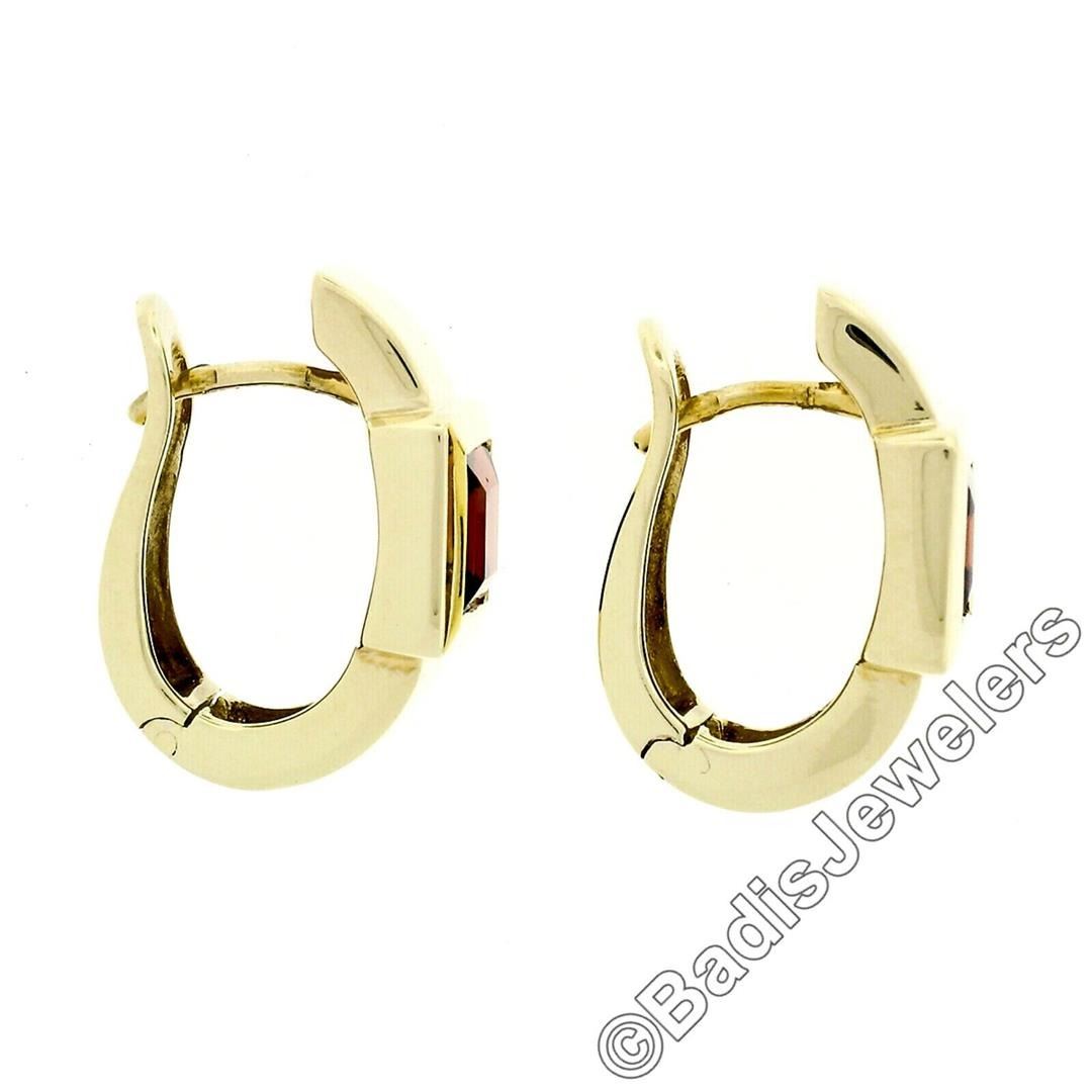 An estate solid 14k yellow gold huggie earrings, with 2 square step cut natural garnets (6.1mm - 2.50ctw). The earrings measure approximately 19.5x9.15mm and weigh a total of 8.60 grams.