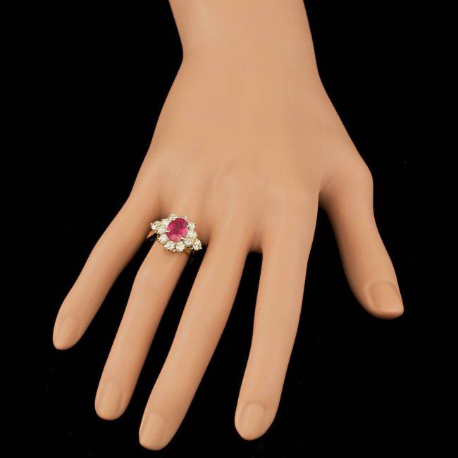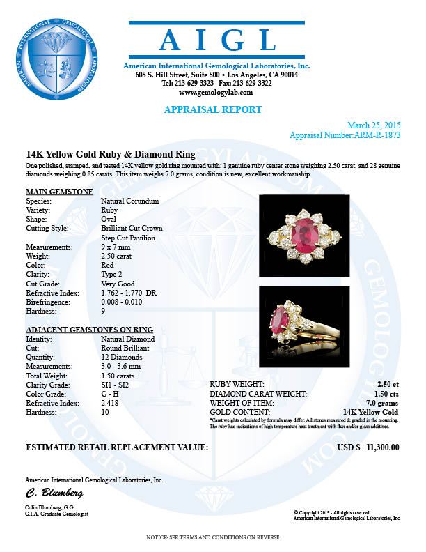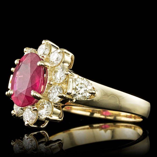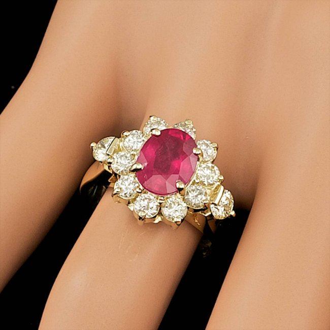 Retail: $11,300.00 ****** 14k Yellow Gold 2.50ct Ruby 1.50ct Diamond Ring ****** Metal: 14k Solid Yellow Gold / Size: 6.5 / Total Item Weight: 7.0 grams / Country Made: United States / / Main Stone: Ruby / Color: Pink / Carat Total Weight: 2.50 / Treatment: Filling / Clarity: Type 2 / Cut: Very Good / / Secondary Stone: Diamond / Carat Total Weight: 1.50 / Treatment: None / Color Grade: G - H / Clarity: SI1 - SI2 / Cut: Very Good /