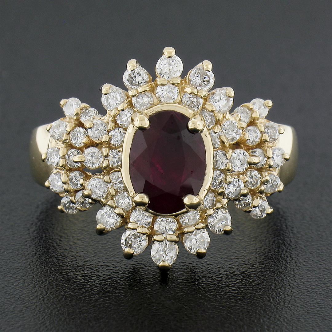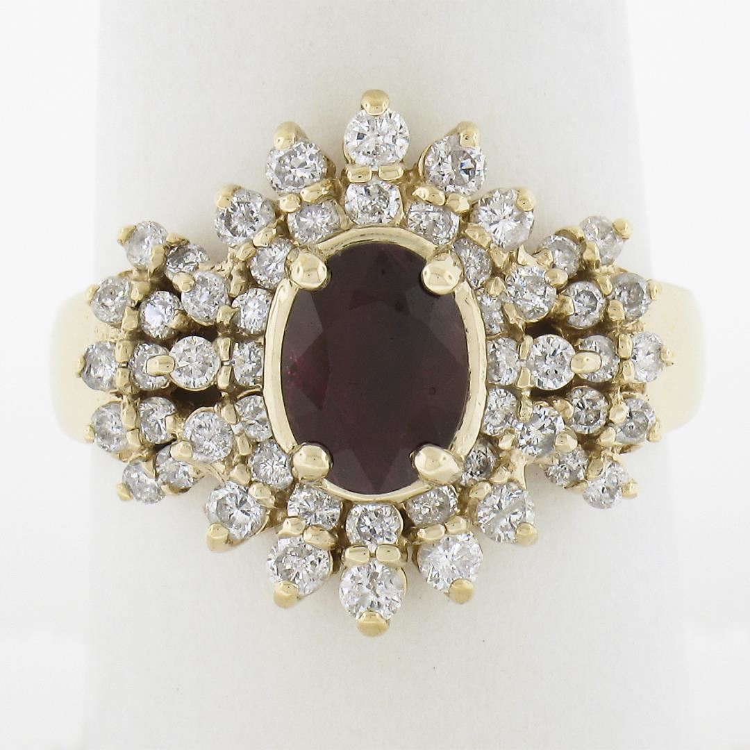 A solid 14k yellow gold cocktail ring, with 1 oval cut natural ruby (1.50ct), and 51 round cut natural diamonds (G-I - SI2-I2 ; 1.02ctw). The ring is size 9.0, weighs a total of 5.66 grams, and measures 17.3mm wide.