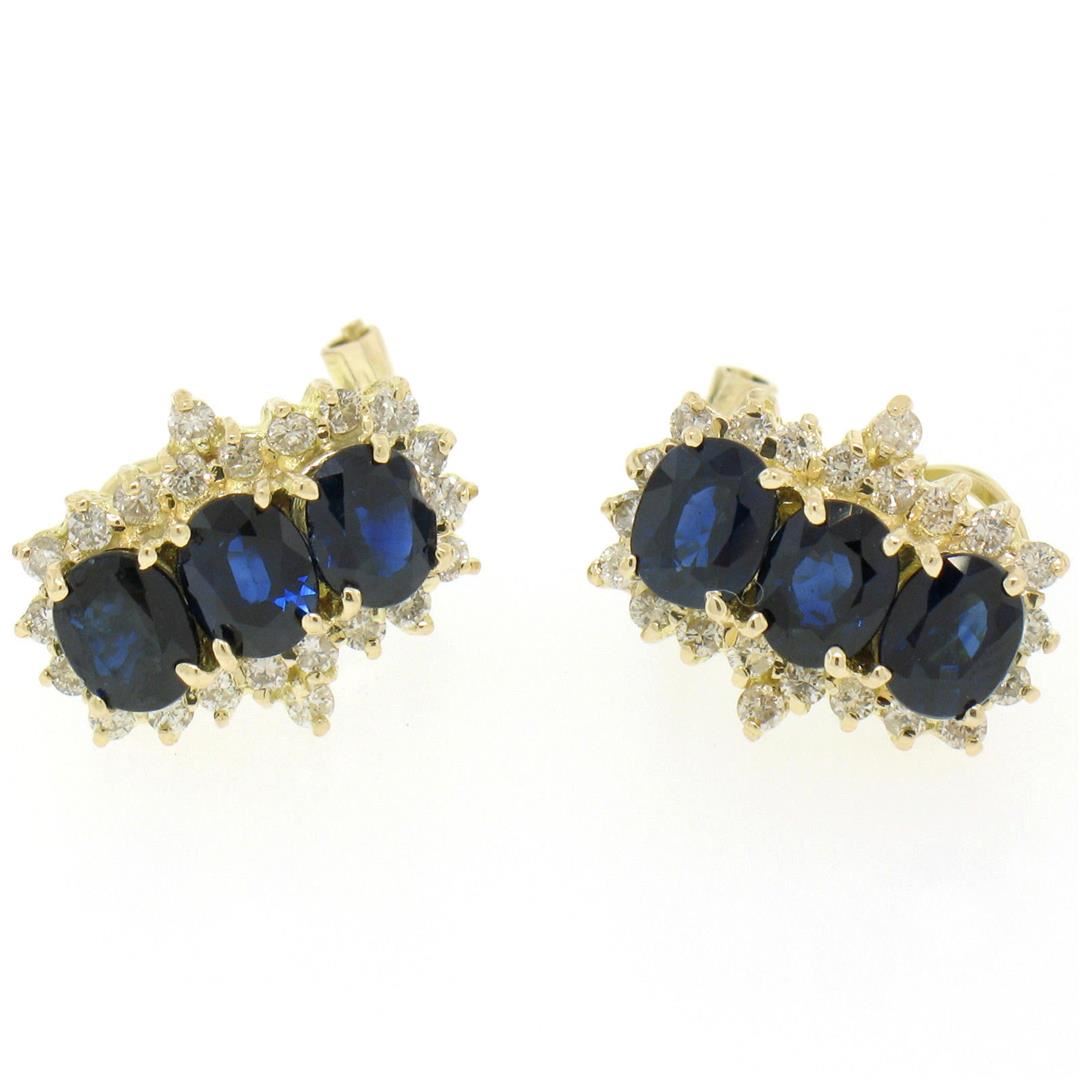 One 14k Yellow Gold 2.80ctw Oval Sapphire Round Diamond Cluster Omega Back Earrings. Item Details - Material: 14K Solid Yellow Gold, Weight: 5.2 Grams, Stone(s): (6) Natural Genuine Sapphires - Oval Cut - Prong Set - Deep Royal Blue Color - 2.00ctw (approx.), (44) Natural Genuine Diamonds - Round Brilliant Cut - Shared Prong Set - H/I Color - SI1 Clarity - 0.80ctw (approx.), Total Carat Weight: 2.80 (approx.), Backing: Post Backs w/ Omega Closures (Pierced ears are required.), Width: 11.45mm, Height: 14.45mm, Thickness: 6.47mm projection off the ear, Condition: Like New!