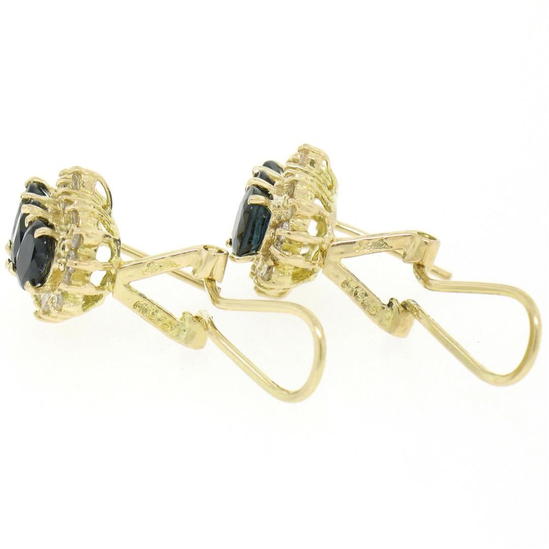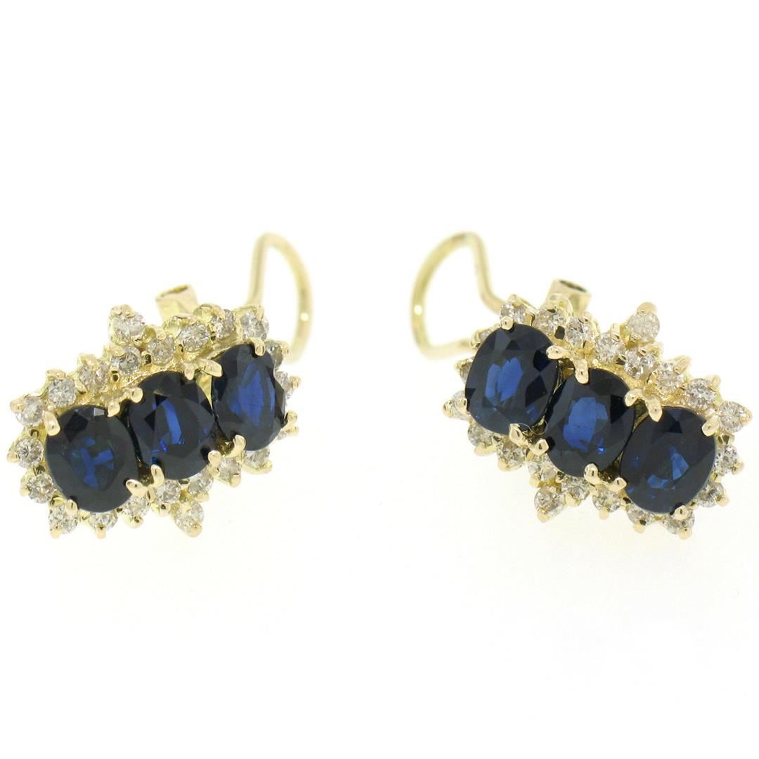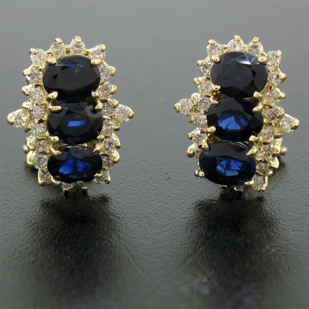 One 14k Yellow Gold 2.80ctw Oval Sapphire Round Diamond Cluster Omega Back Earrings. Item Details - Material: 14K Solid Yellow Gold, Weight: 5.2 Grams, Stone(s): (6) Natural Genuine Sapphires - Oval Cut - Prong Set - Deep Royal Blue Color - 2.00ctw (approx.), (44) Natural Genuine Diamonds - Round Brilliant Cut - Shared Prong Set - H/I Color - SI1 Clarity - 0.80ctw (approx.), Total Carat Weight: 2.80 (approx.), Backing: Post Backs w/ Omega Closures (Pierced ears are required.), Width: 11.45mm, Height: 14.45mm, Thickness: 6.47mm projection off the ear, Condition: Like New!