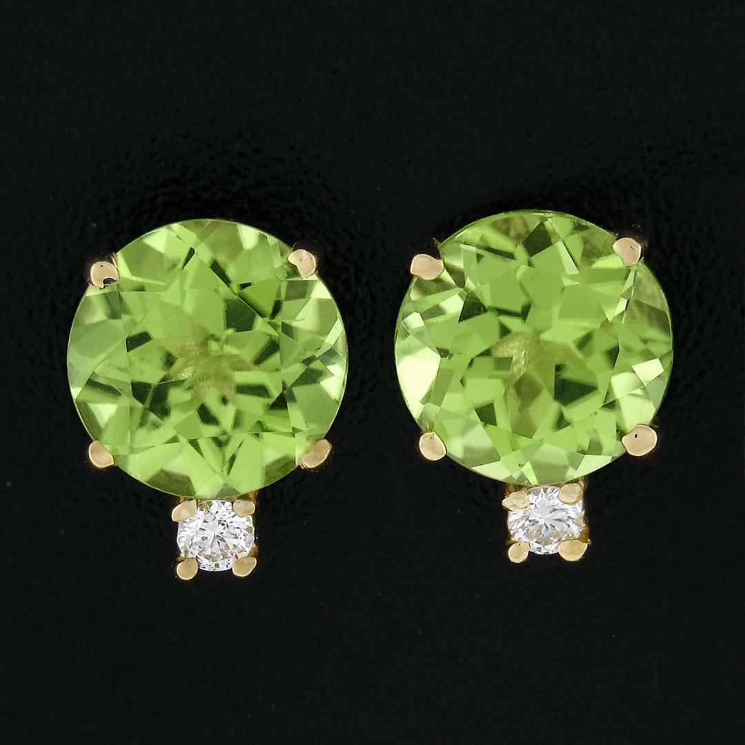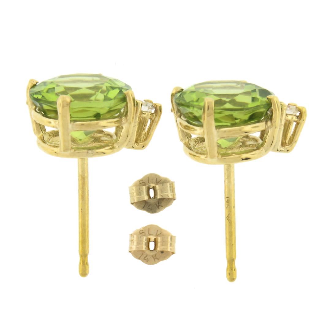 A solid 14k yellow gold stud earrings, featuring 2 round cut natural peridots (7.2mm / 2.80ctw), and 2 round brilliant cut natural diamonds (G/H - SI1/SI2 ; 0.06ctw). The earrings measure approximately 9.6x7.2mm and weigh a total of 1.68 grams.