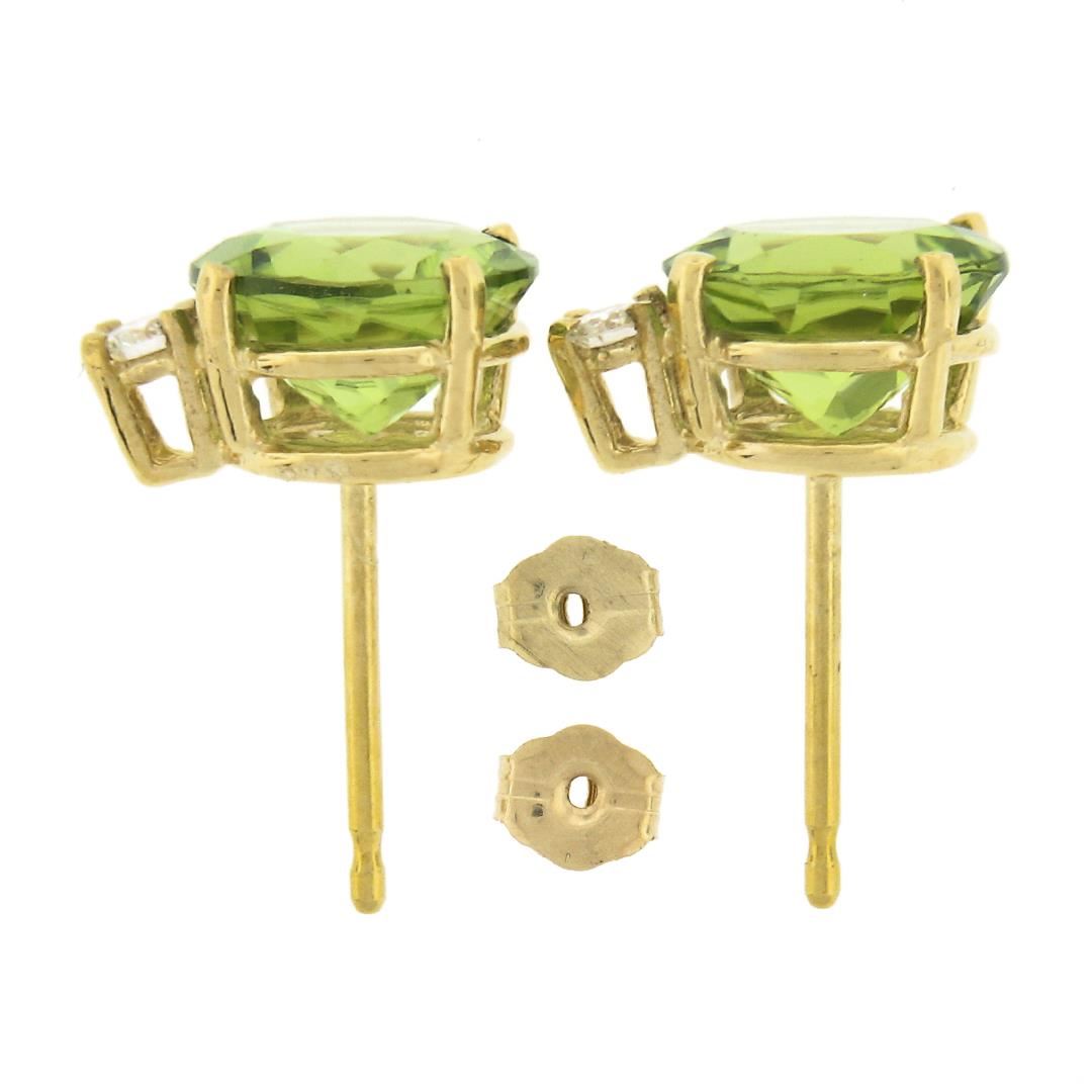 A solid 14k yellow gold stud earrings, featuring 2 round cut natural peridots (7.2mm / 2.80ctw), and 2 round brilliant cut natural diamonds (G/H - SI1/SI2 ; 0.06ctw). The earrings measure approximately 9.6x7.2mm and weigh a total of 1.68 grams.