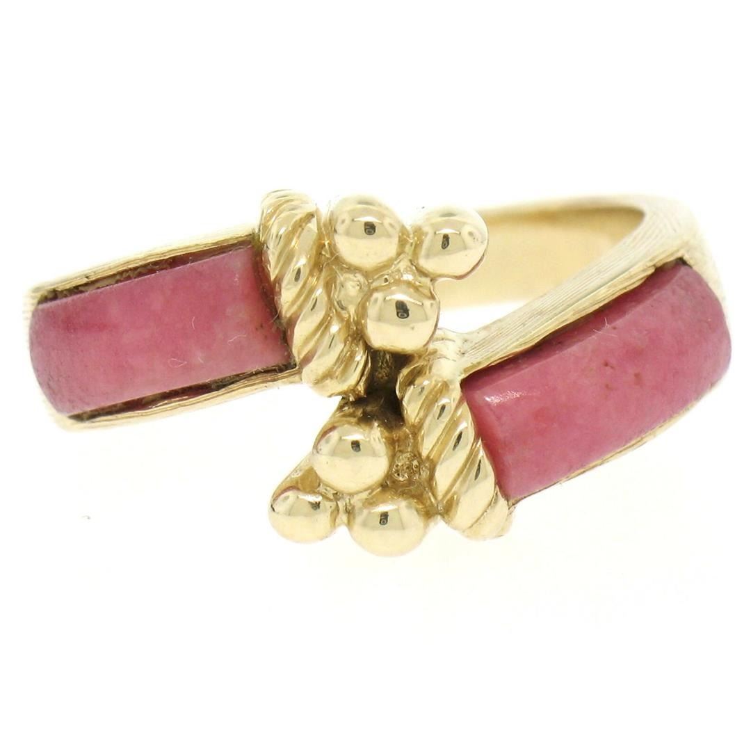 One Vintage Textured 14k Yellow Gold 2 Bezel Set Rectangular Pink Jade Bypass Ring. Item Details: Material: Solid 14k Yellow Gold, Weight: 8.19 Grams, Stone(s): (2) Natural Genuine Jade - Rectangular Cut - Bezel Set - Rich Pink Color - 10.13x3.55mm (approx.), Ring Size: 6.5, Ring Width: 10.97mm at the center of the bypass, Ring Height: 6.39mm rise off the finger, Condition: Vintage piece. Excellent condition!,