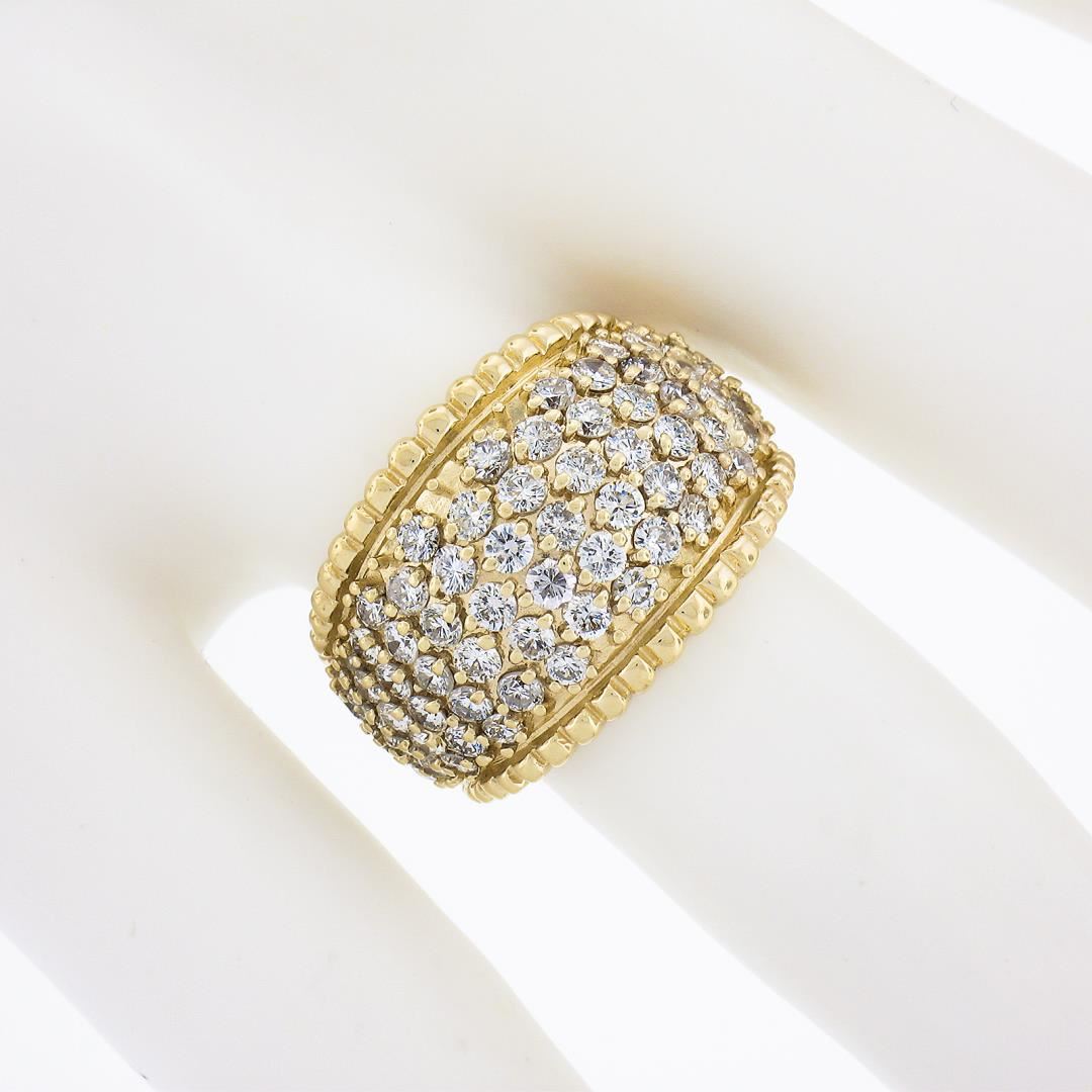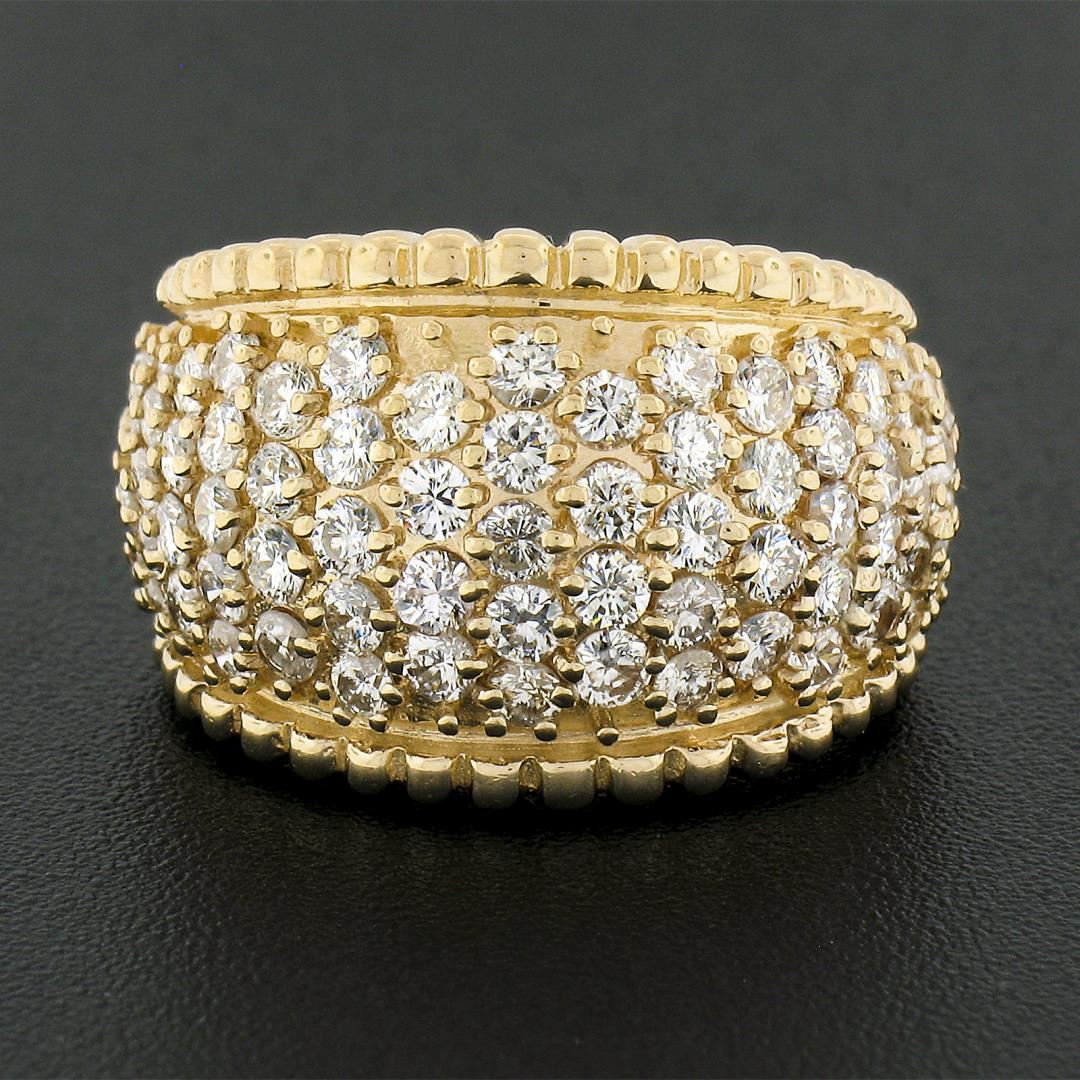 A solid 14k yellow gold cigar band ring, with 77 round cut natural diamonds (H/I - VS2-SI1; 2ctw). The ring is size 5.5, weighs a total of 8.15 grams, and measures 14.2mm wide.