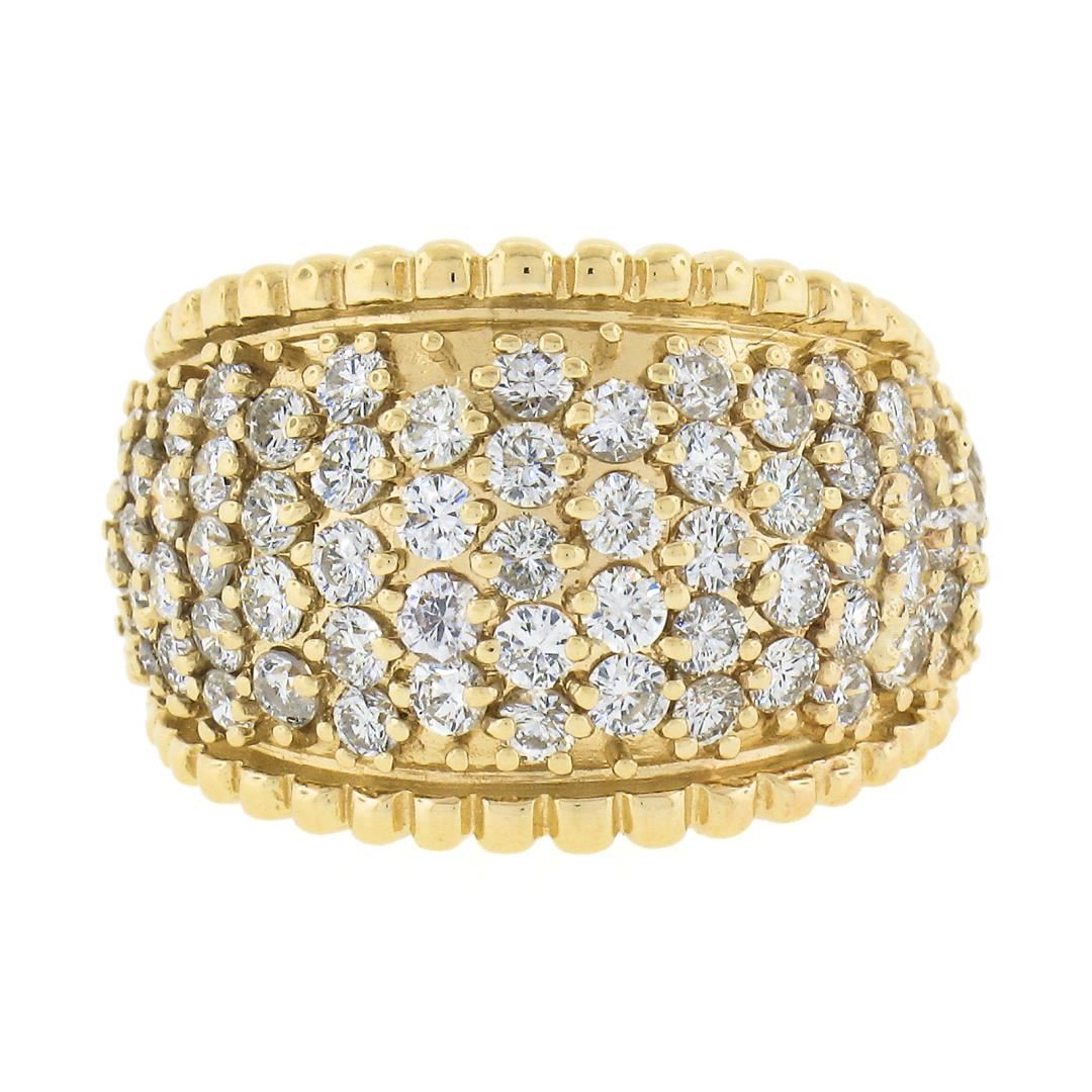 A solid 14k yellow gold cigar band ring, with 77 round cut natural diamonds (H/I - VS2-SI1; 2ctw). The ring is size 5.5, weighs a total of 8.15 grams, and measures 14.2mm wide.