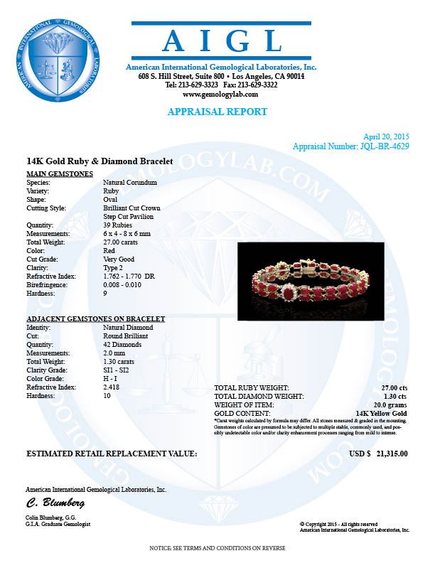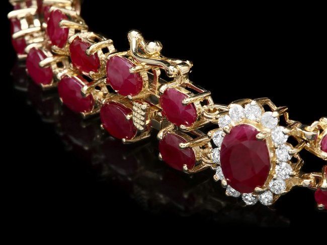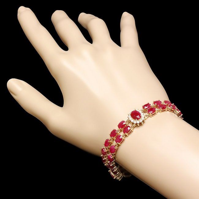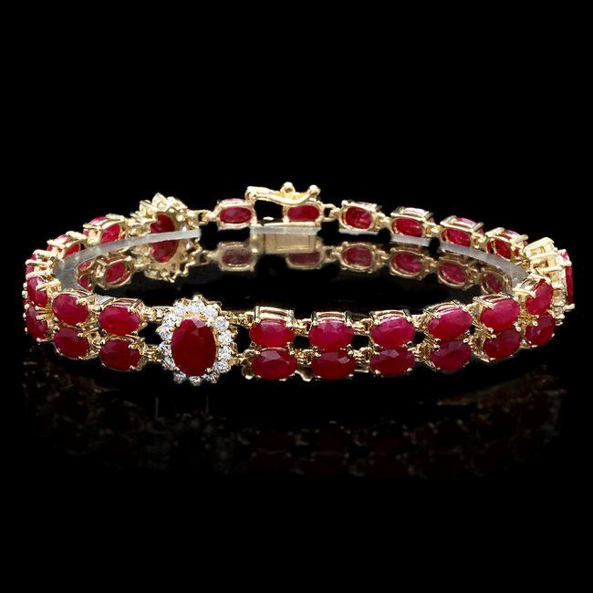Retail: $21,200.00 ****** 14k Yellow Gold 27ct Ruby 1.30ct Diamond Bracelet ****** Metal: 14k Solid Yellow Gold / Size: 7 / Total Item Weight: 20 grams / Country Made: United States / / Main Stone: Ruby / Color: Red / Carat Total Weight: 5.00 / Treatment: None / Clarity: Type 2 / Cut: Very Good / / Secondary Stone: Diamond / Carat Total Weight: 1.30 / Treatment: None / Color Grade: H - I / Clarity: SI1 - SI2 / Cut: Very Good / / Side Stone: Ruby / Color: Red / Carat Total Weight: 22 / Treatment: None / Clarity: Type 2 / Cut: Very Good /