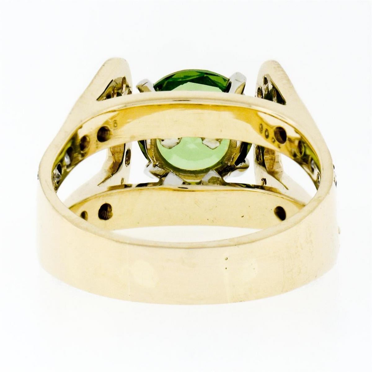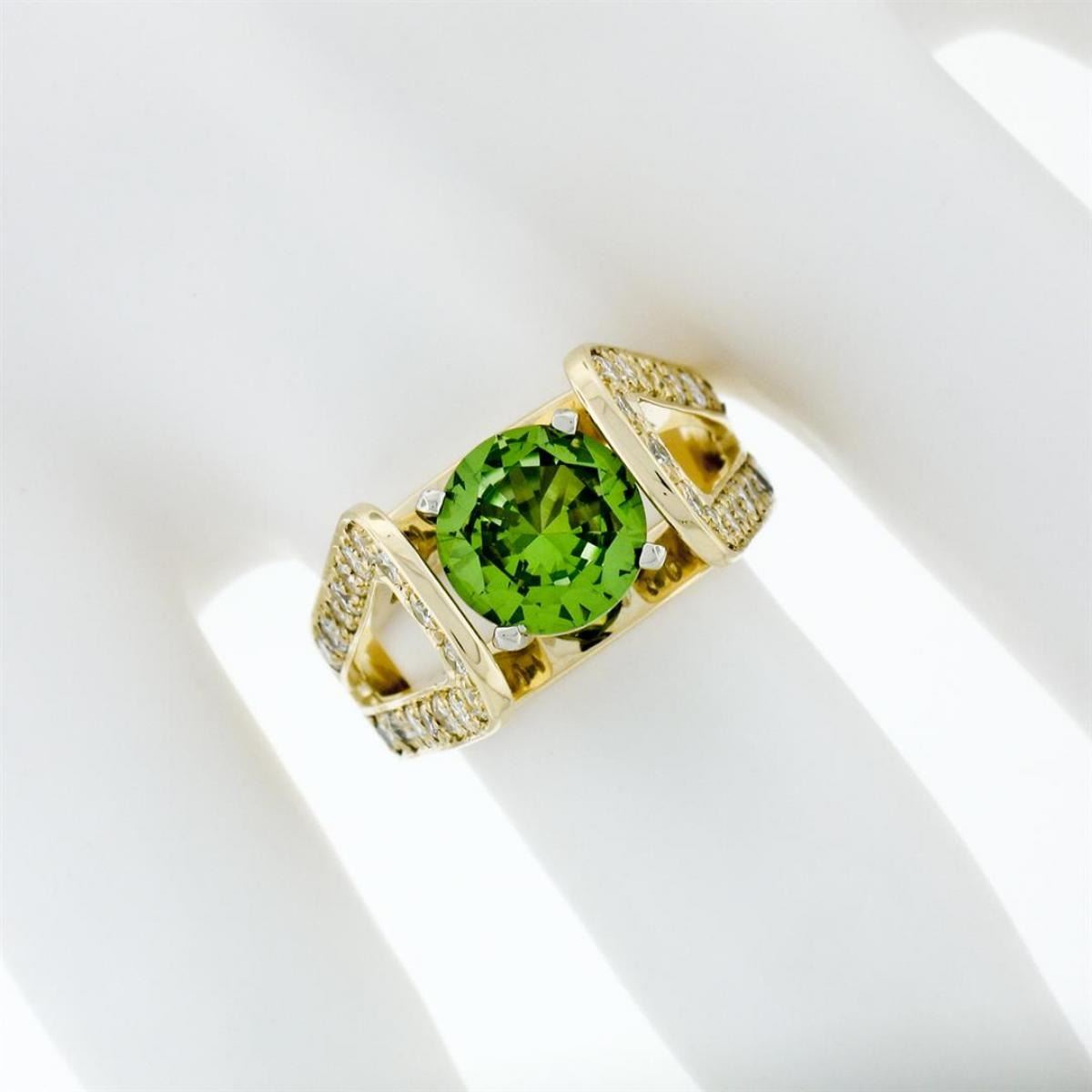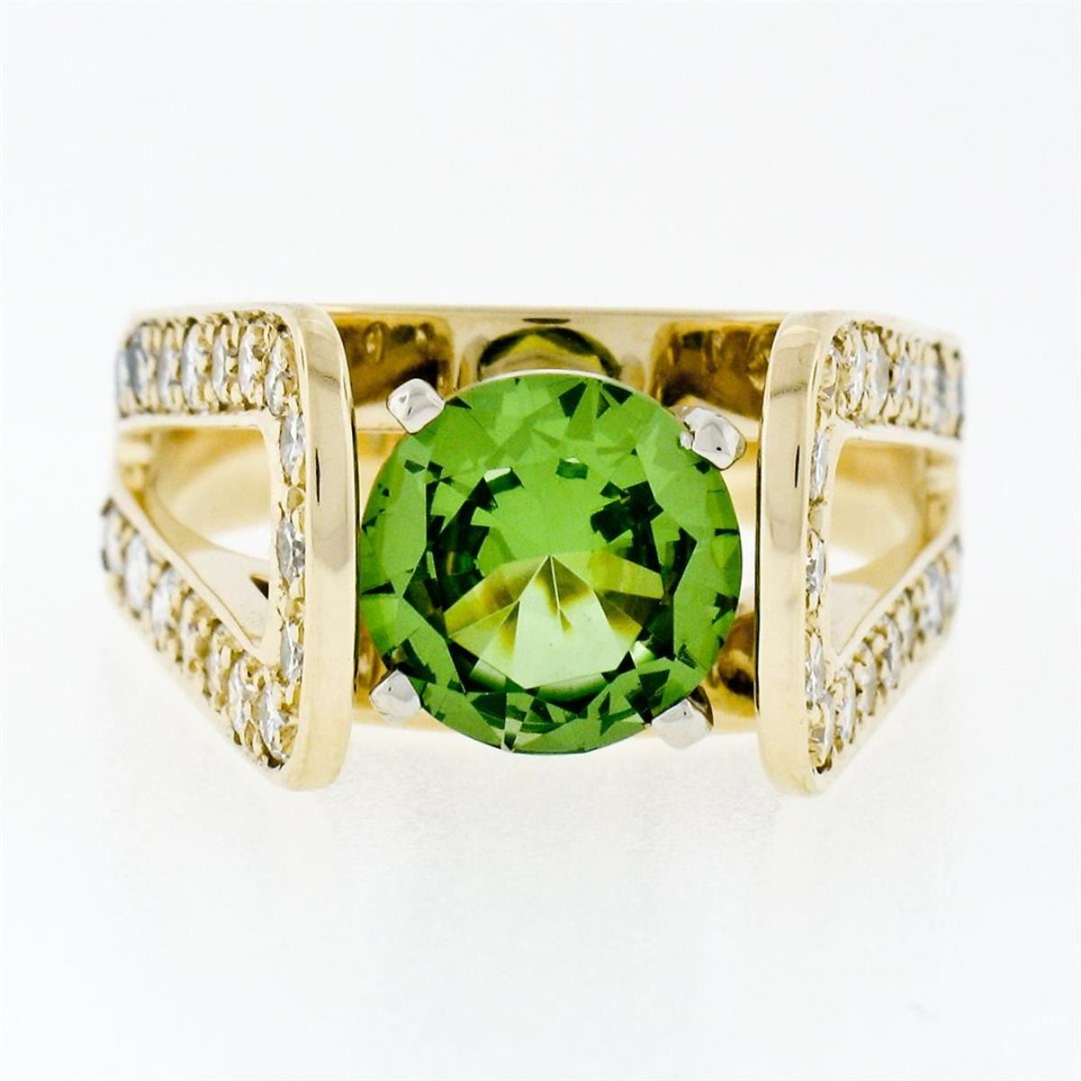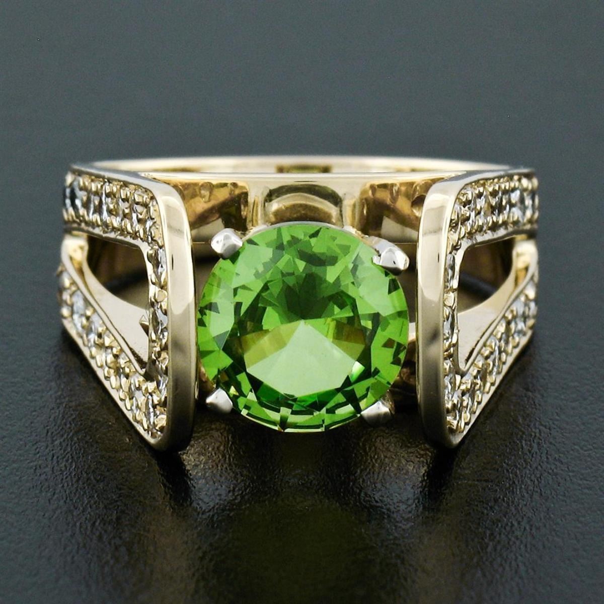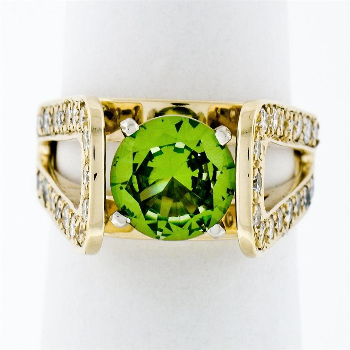 14k Yellow Gold 3.0ctw Round Peridot Solitaire & Ideal Cut Diamond Cocktail Ring. A solid 14k yellow gold ring featuring a round brilliant cut natural peridot solitaire (8.0mm; 2.00ct) accented by 34 ideal round brilliant cut natural diamonds (F/G - VS1/VS2; 1.00ctw). The ring is size 6.0, weighs a total of 6.05 grams, and measures 10.15mm wide.