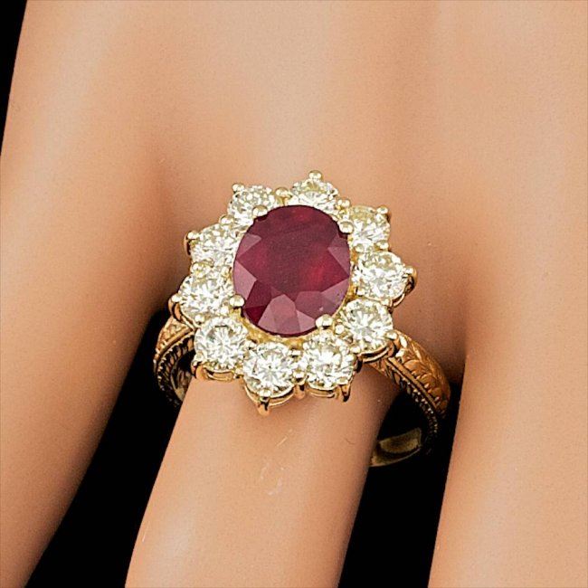 Retail: $14,800.00 ****** 14k Yellow Gold 3.00ct Ruby 2.10ct Diamond Ring ****** Metal: 14k Solid Yellow Gold / Size: 7.25 / Total Item Weight: 6.5 grams / Country Made: United States / / Main Stone: Ruby / Color: Red / Carat Total Weight: 3.00 / Treatment: Filling / Clarity: Type 2 / Cut: Very Good / / Secondary Stone: Diamond / Carat Total Weight: 2.10 / Treatment: None / Color Grade: G - H / Clarity: SI1 - SI2 / Cut: Very Good /