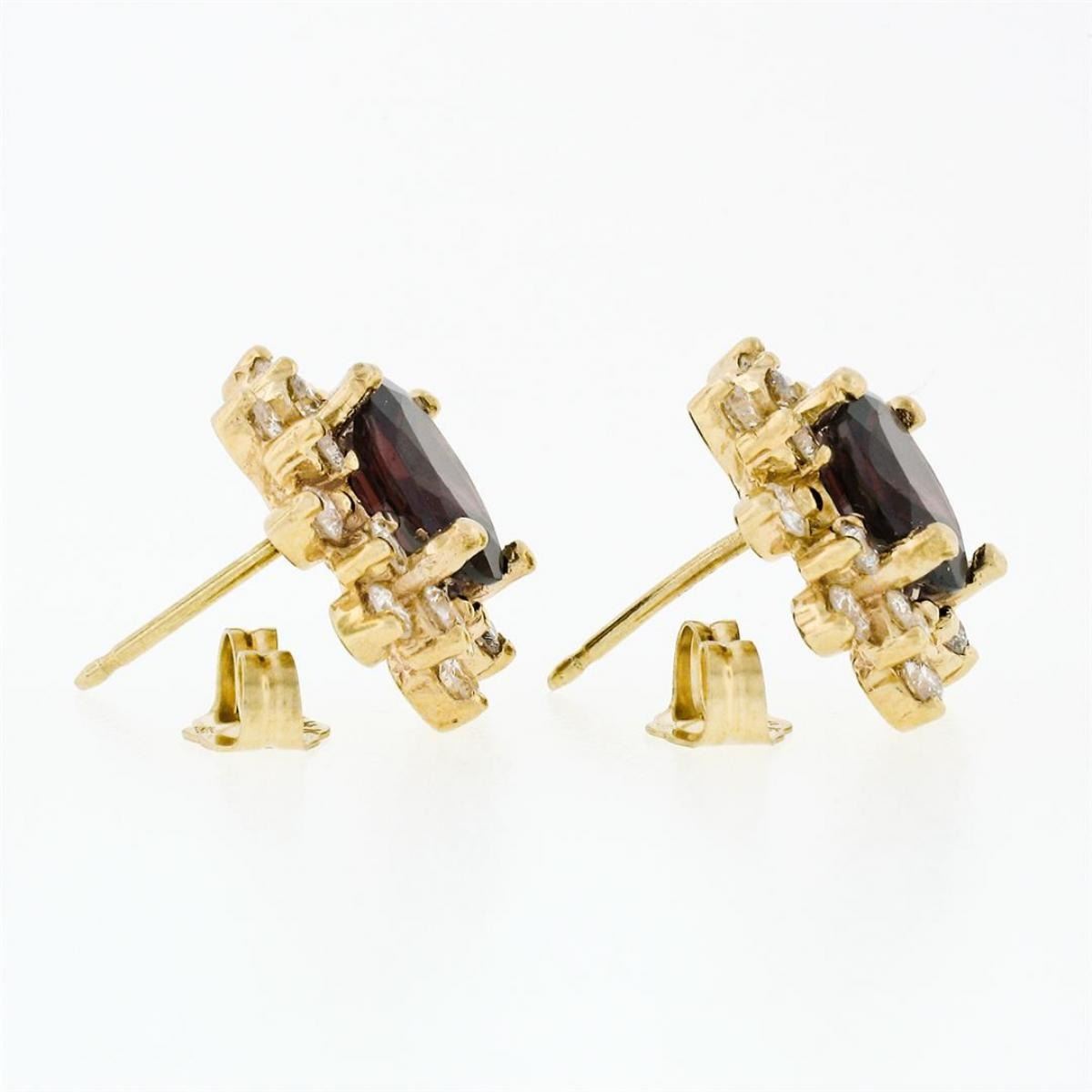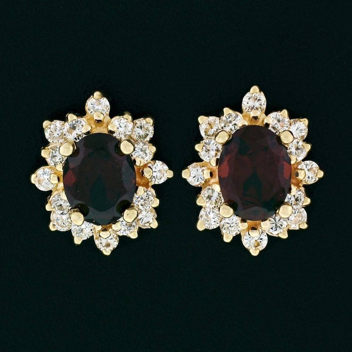 14k Yellow Gold 3.80ctw Oval Garnet & Layered Round Diamond Halo Stud Earrings. A pair of solid 14k yellow gold stud earrings featuring a pair of oval cut natural garnets (8.0x6.1mm; 2.80ctw) surrounded by halos of round brilliant cut natural diamonds (F/
