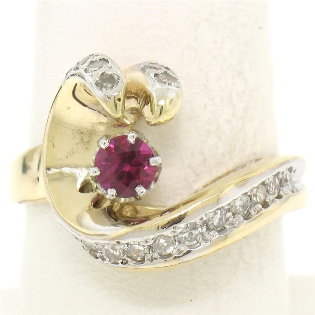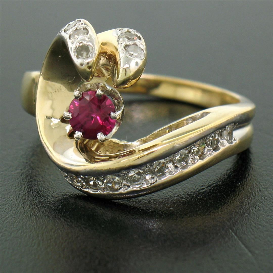 14k Yellow Gold .30 ctw Round Blood Red Ruby Claw Cocktail Ring w/ Diamond Accen