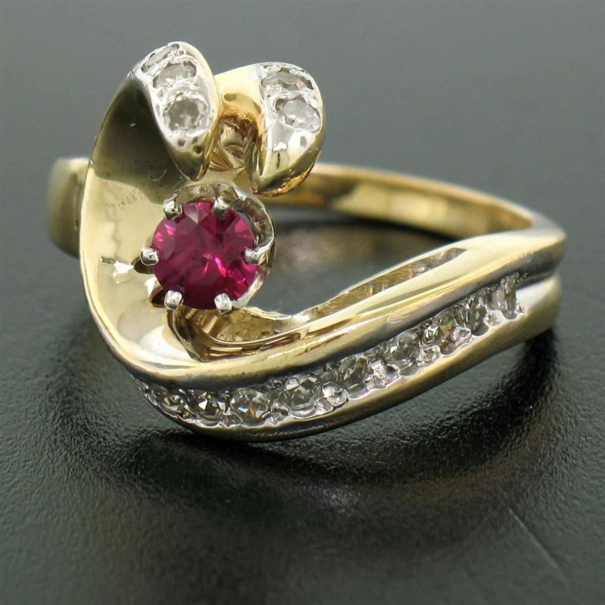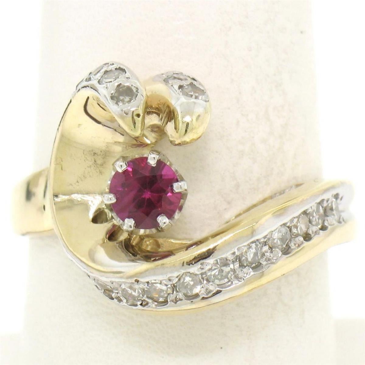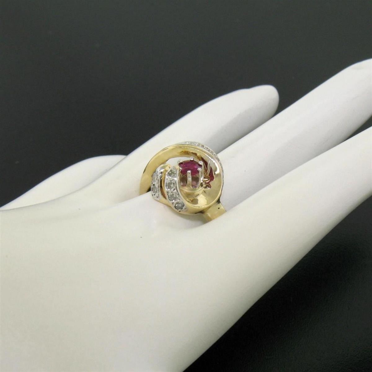 One 14k Yellow Gold .30 ct Round Blood Red Ruby Claw Cocktail Ring w/ Diamond Accents. Item Details: Material: 14k Solid Yellow Gold, Weight: 6.60 Grams, Stone(s): (1) Natural Genuine Ruby - Round Cut - Prong Set - Rich Blood Red Color - 0.30 ct (approx.), (18) Natural Genuine Diamonds - Single Cut - Pavé Set - G/H Color - VS1/VS2 Clarity - 0.40 ctw (approx.), Total Carat Weight: 0.70 (approx.), Ring Size: 8.5, Ring Width: 15.0mm, Ring Height: 6.5mm rise off the finger. Condition: Vintage piece. Like New condition!