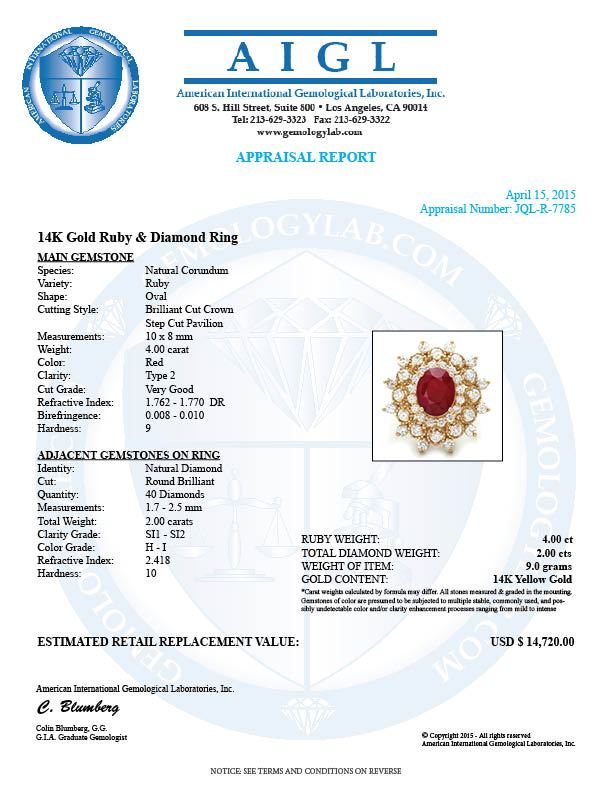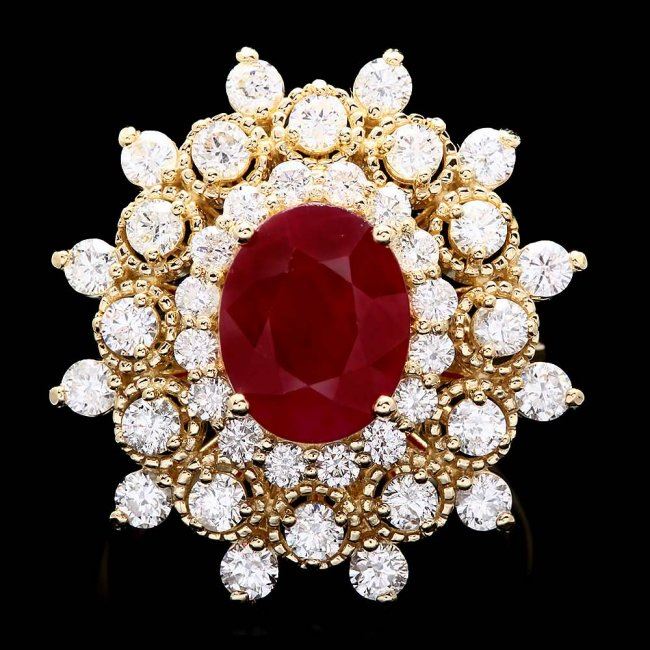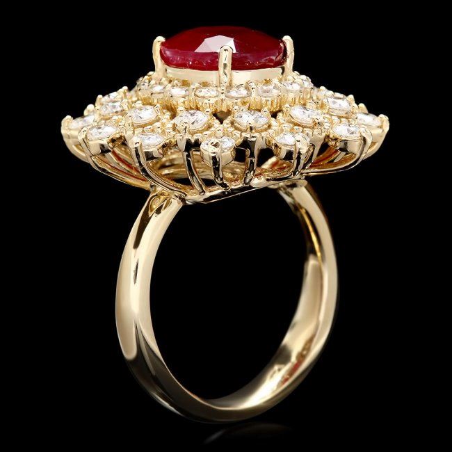 Retail: $14,600.00 ****** 14k Yellow Gold 4.00ct Ruby 2.00ct Diamond Ring ****** Metal: 14k Solid Yellow Gold / Size: 5.75 / Total Item Weight: 9.0 grams / Country Made: United States / / Main Stone: Ruby / Color: Red / Carat Total Weight: 4.00 / Treatment: None / Clarity: Type 2 / Cut: Very Good / / Secondary Stone: Diamond / Carat Total Weight: 2.00 / Treatment: None / Color Grade: H - I / Clarity: SI1 - SI2 / Cut: Very Good /