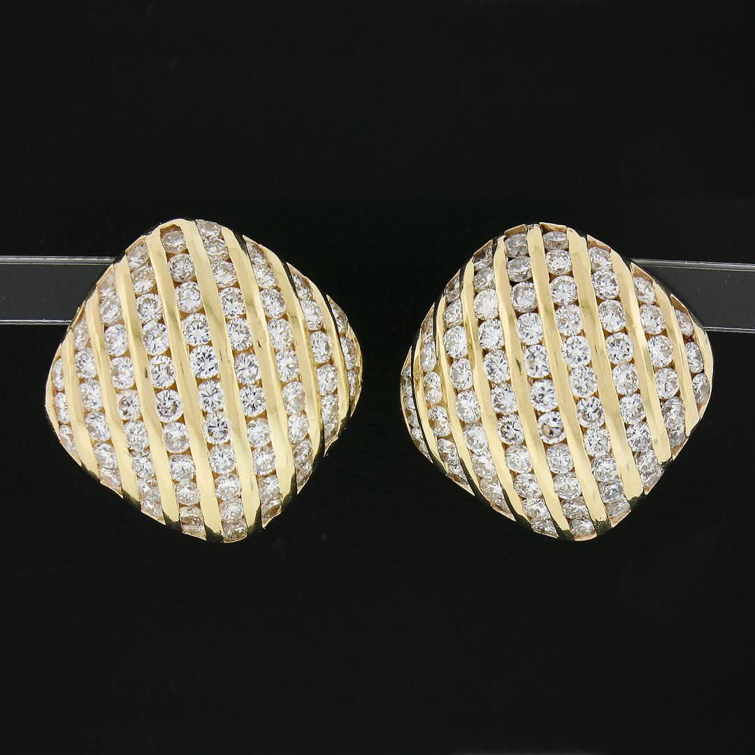 A solid 14k yellow gold button earrings, with 138 round cut natural diamonds (G-H - VS1/VS2 w/ a few SI ; 4.14ctw). The earrings measure approximately 21x20.7mm and weigh a total of 13.82 grams.
