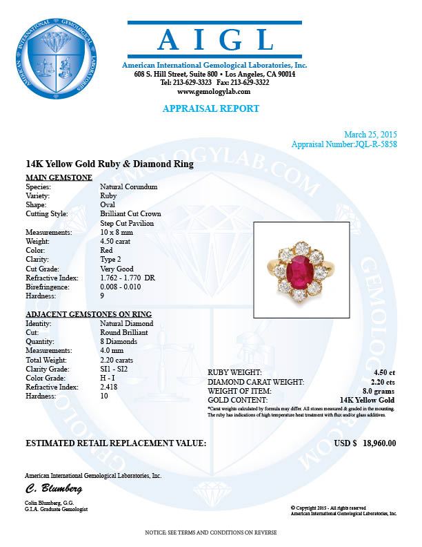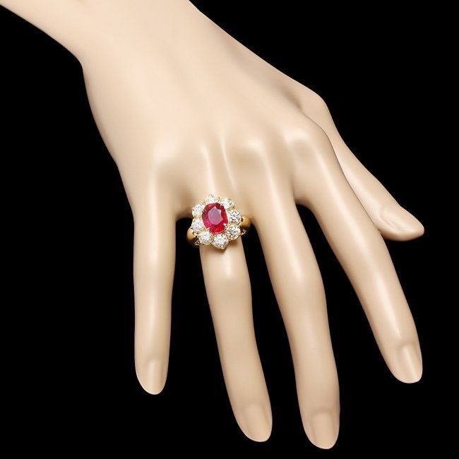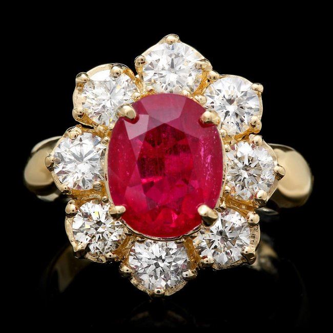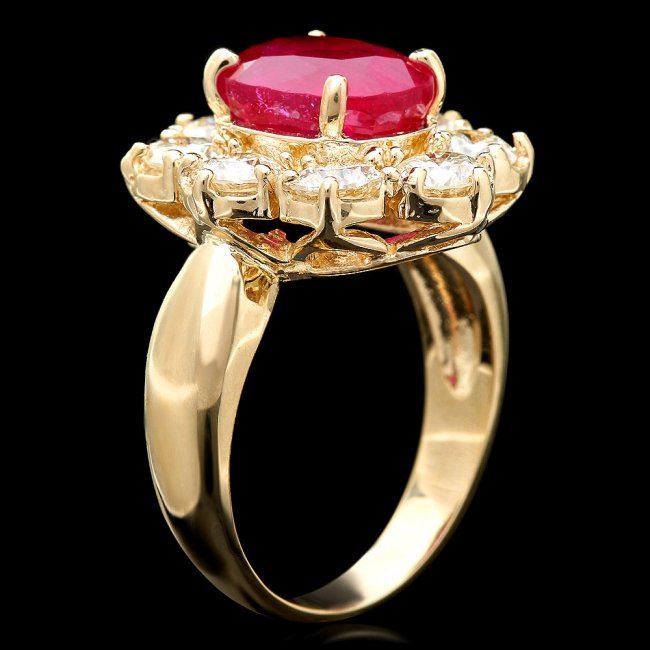 Retail: $18,960.00 ****** 14k Yellow Gold 4.50ct Ruby 2.20ct Diamond Ring ****** Metal: 14k Solid Yellow Gold / Size: 7 / Total Item Weight: 8.0 grams / Country Made: United States / / Main Stone: Ruby / Color: Red / Carat Total Weight: 4.50 / Treatment: Filling / Clarity: Type 2 / Cut: Very Good / / Secondary Stone: Diamond / Carat Total Weight: 2.20 / Treatment: None / Color Grade: H - I / Clarity: SI1 - SI2 / Cut: Very Good /