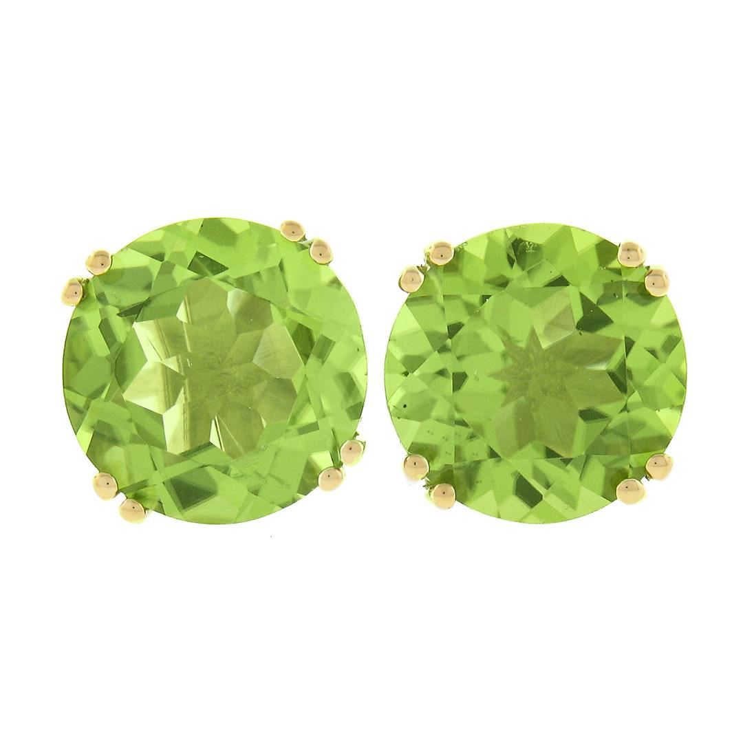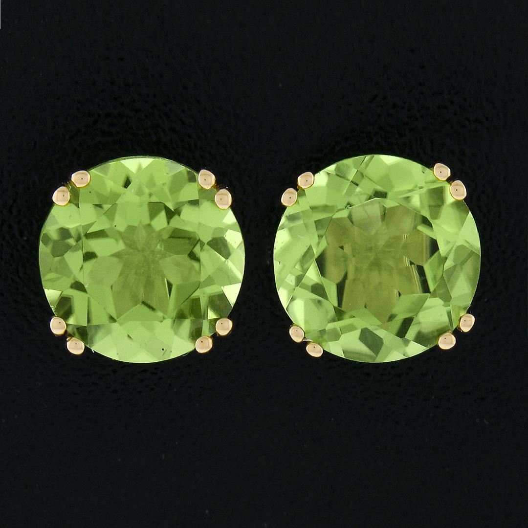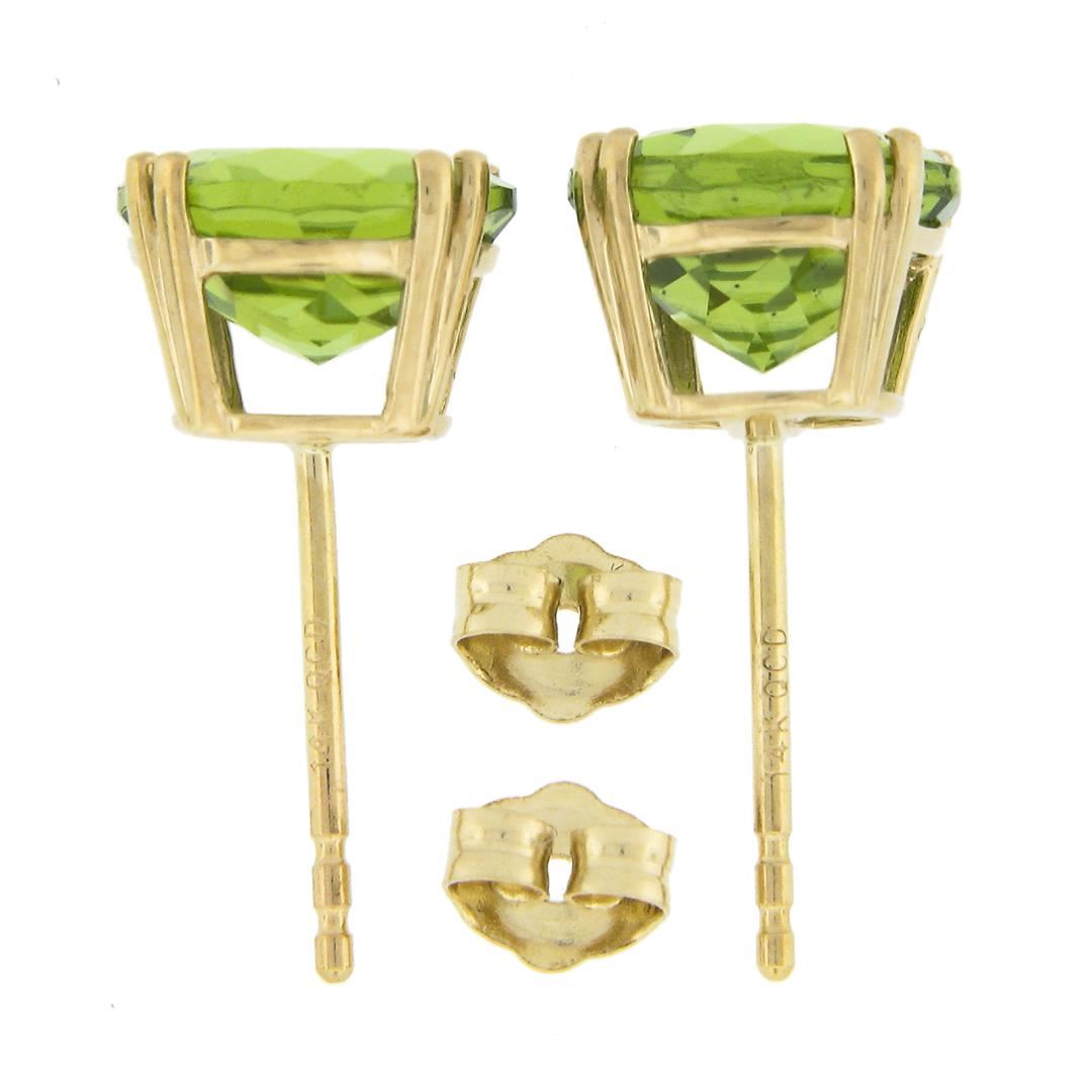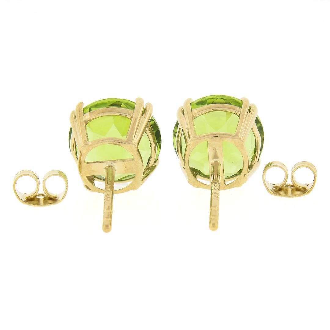 A solid 14k yellow gold stud earrings, with 2 round cut natural peridots (4ctw). The earrings measure approximately 8mm and weigh a total of 1.67 grams.