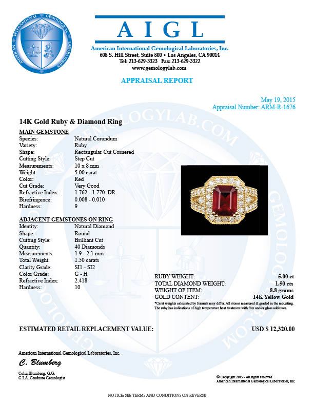 Retail: $12,200.00 ****** 14k Yellow Gold 5.00ct Ruby 1.50ct Diamond Ring ****** Metal: 14k Solid Yellow Gold / Size: 6.75 / Total Item Weight: 8.8 grams / Country Made: United States / / Main Stone: Ruby / Color: Red / Carat Total Weight: 5.00 / Treatment: Filling / Clarity: Type 2 / Cut: Very Good / / Secondary Stone: Diamond / Carat Total Weight: 1.50 / Treatment: None / Color Grade: G - H / Clarity: SI1 - SI2 / Cut: Very Good /