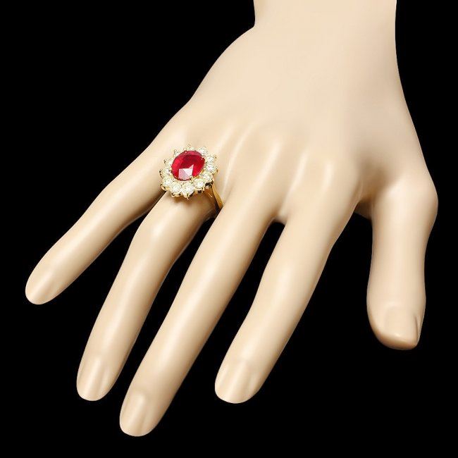 Retail: $11,300.00 ****** 14k Yellow Gold 5.00ct Ruby 2.00ct Diamond Ring ****** Metal: 14k Solid Yellow Gold / Size: 7.25 / Total Item Weight: 6.5 grams / Country Made: United States / / Main Stone: Ruby / Color: Red / Carat Total Weight: 5.00 / Treatment: Filling / Clarity: Type 2 / Cut: Very Good / / Secondary Stone: Diamond / Carat Total Weight: 2.00 / Treatment: None / Color Grade: H - I / Clarity: SI1 - SI2 / Cut: Very Good /