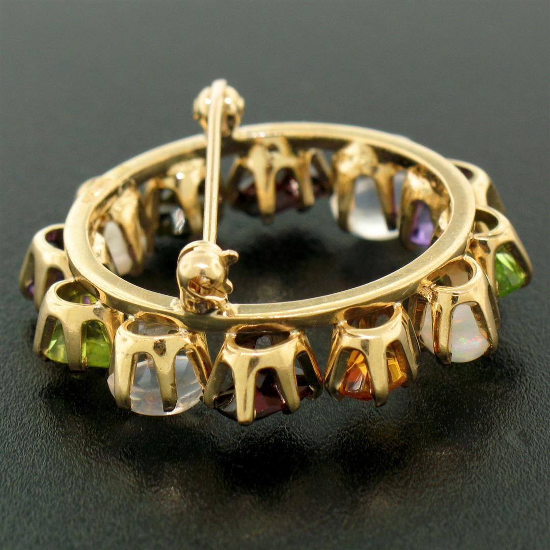 One 14k Yellow Gold 5.18ctw Wreath Brooch w/ Amethyst Garnet Moonstone Peridot Opal. Item Details: Material: 14k Solid Yellow Gold, Weight: 6.7 Grams, Stone(s): (2) Natural Genuine Amethysts - Oval Cut - Prong Set - Rich Medium Purple Color - 0.85ctw (approx.), (2) Natural Genuine Peridot - Oval Cut - Prong Set - Lime Green Color - 0.96ctw (approx.), (2) Natural Genuine Garnets - Oval Cut - Prong Set - Deep Orange-Red Color - 1.04ctw (approx.), (2) Natural Genuine Opals - Oval Cabochon Cut - Prong Set - Beautiful Red and Green Plays of Color - 0.50ctw (approx.), (2) Natural Genuine Moonstones - Oval Cabochon Cut - Prong Set - Pale Violetish-Blue Color - 0.86ctw (approx.), (1) Natural Genuine Citrine - Oval Cut - Prong Set - Rich Yellow-Orange Color - 0.42ct (approx.), (1) Natural Genuine Topaz - Oval Cut - Prong Set - Deep Greenish-Brown Color - 0.55ct (approx.), Total Carat Weight: 5.18 (approx.), Width: 30.06mm, Height: 29.99mm, Thickness: 5.86mm, Condition: Excellent condition!