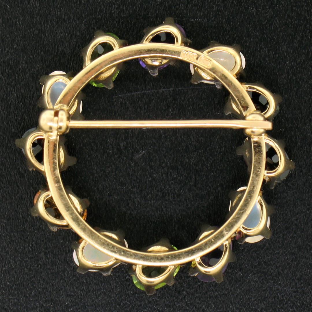 An estate solid 14k yellow gold wreath pin booch, with oval cut 2 natural amethysts (0.85ctw), 2 natural peridots (0.96ctw), 2 naural garnets (1.04ctw), 2 natural opals (0.50ctw), 2 natural moonstones (0.86ctw ), 1 natural citrine (0.42ct), and 1 natural topaz (0.55ct). Measures 29.99x30.06mm and weighs a total of 6.7 grams.