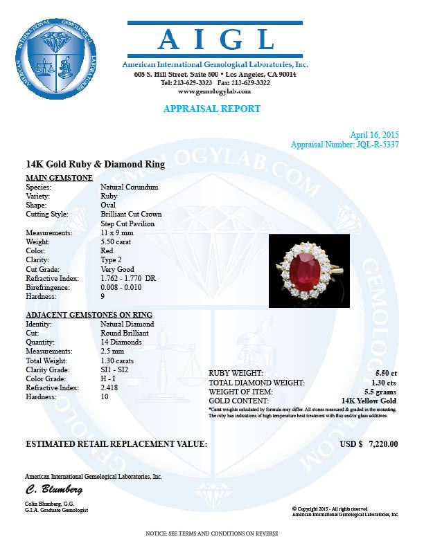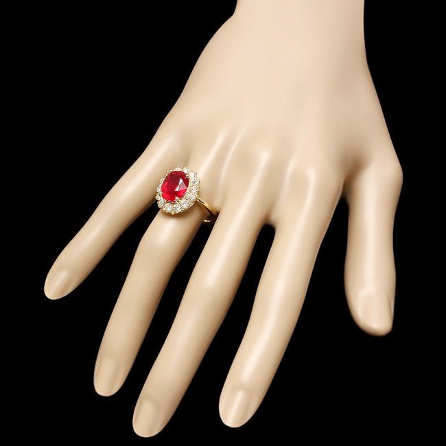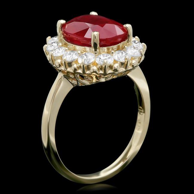 Retail: $7,100.00 ****** 14k Yellow Gold 5.50ct Ruby 1.30ct Diamond Ring ****** Metal: 14k Solid Yellow Gold / Size: 7.5 / Total Item Weight: 5.5 grams / Country Made: United States / / Main Stone: Ruby / Color: Red / Carat Total Weight: 5.50 / Treatment: Filling / Clarity: Type 2 / Cut: Very Good / / Secondary Stone: Diamond / Carat Total Weight: 1.30 / Treatment: None / Color Grade: H - I / Clarity: SI1 - SI2 / Cut: Very Good /